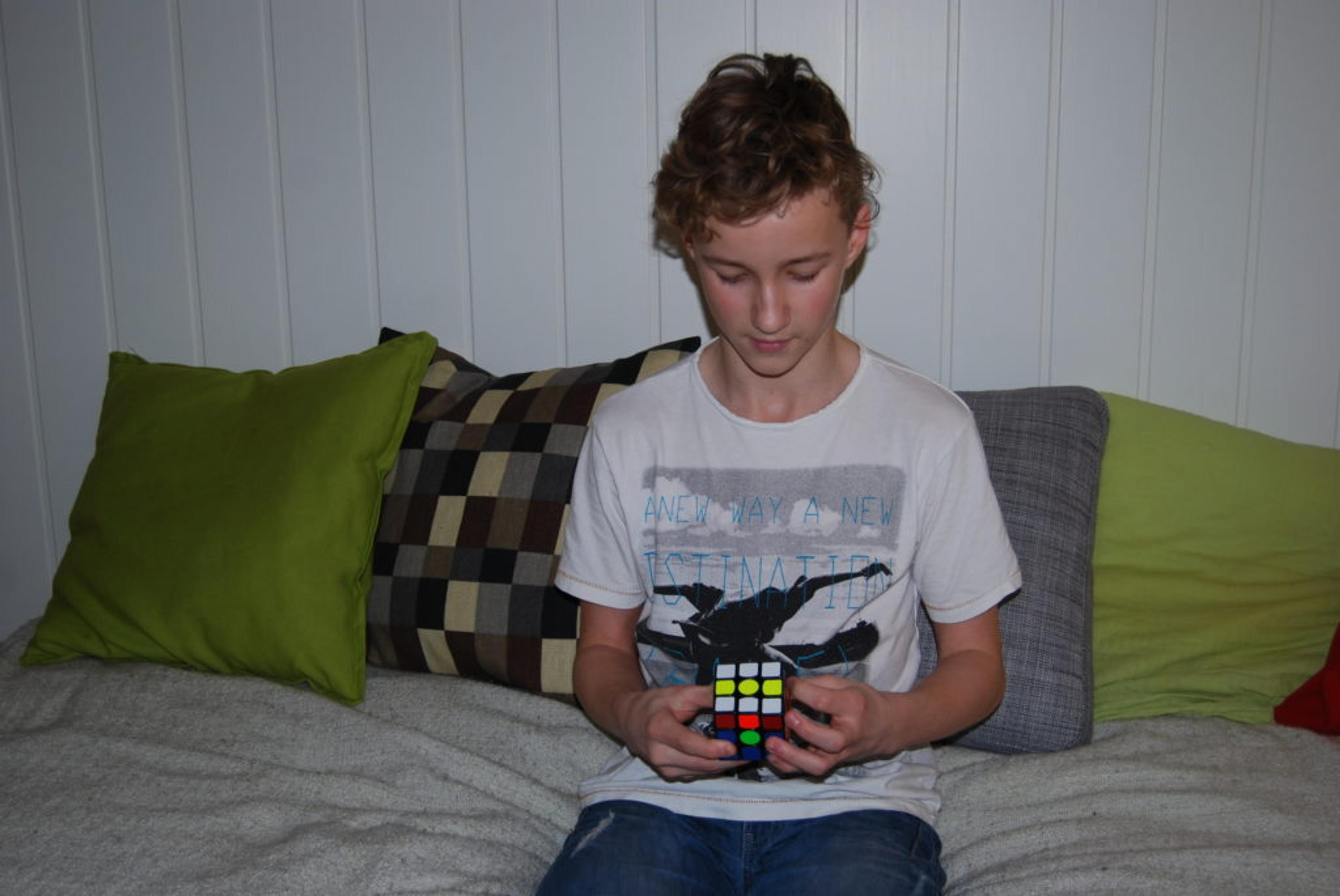 NM: Her løser Daniel Fiskerstrand (13) en Rubiks kube hjemme i Undrumsdal, denne helga løste han mange i NM. Foto: Amalie Andersen
