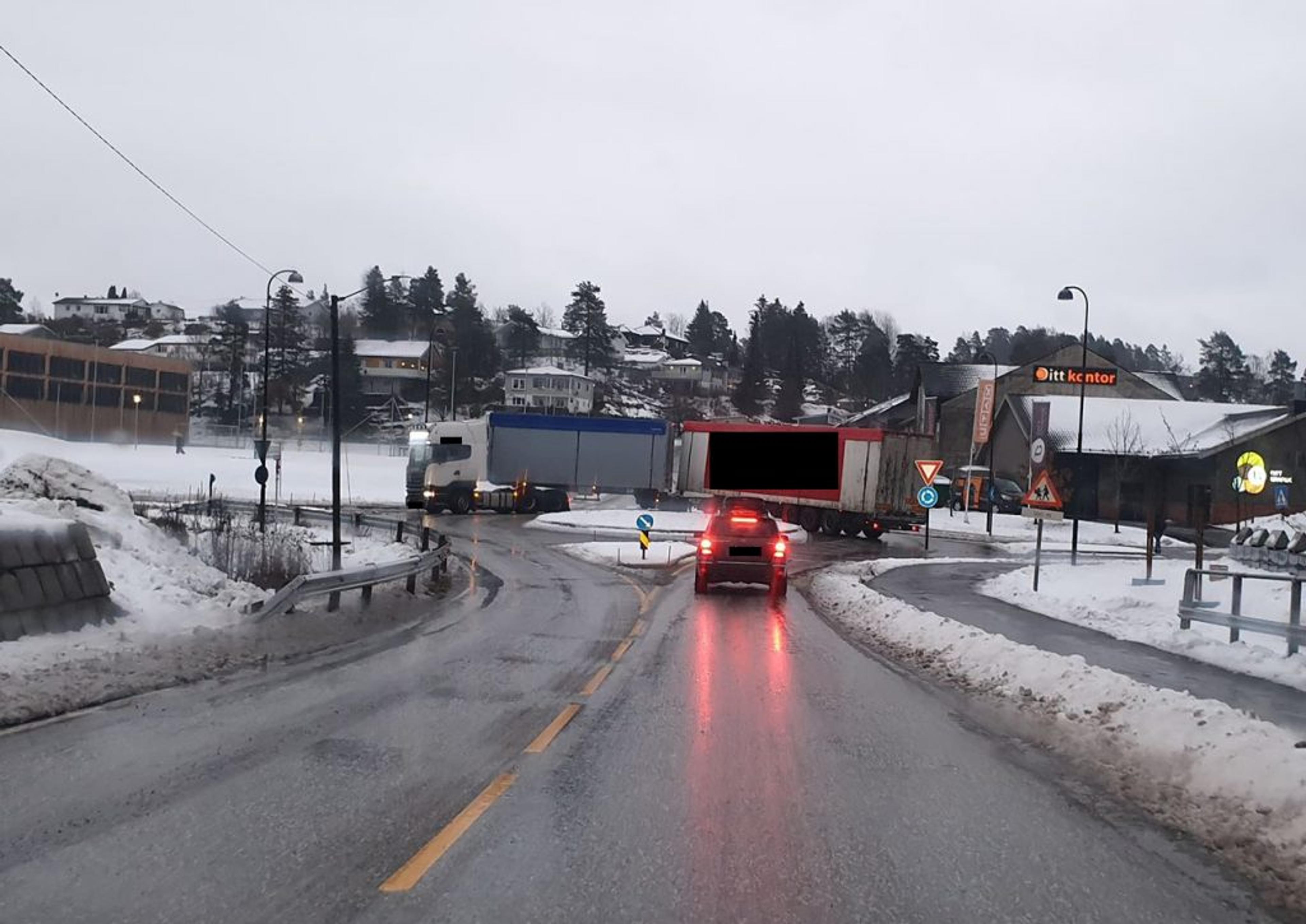 Og rett borti den andre rundkjøringa, ligger fortsattvarebilen i grøfta etter sist helg.