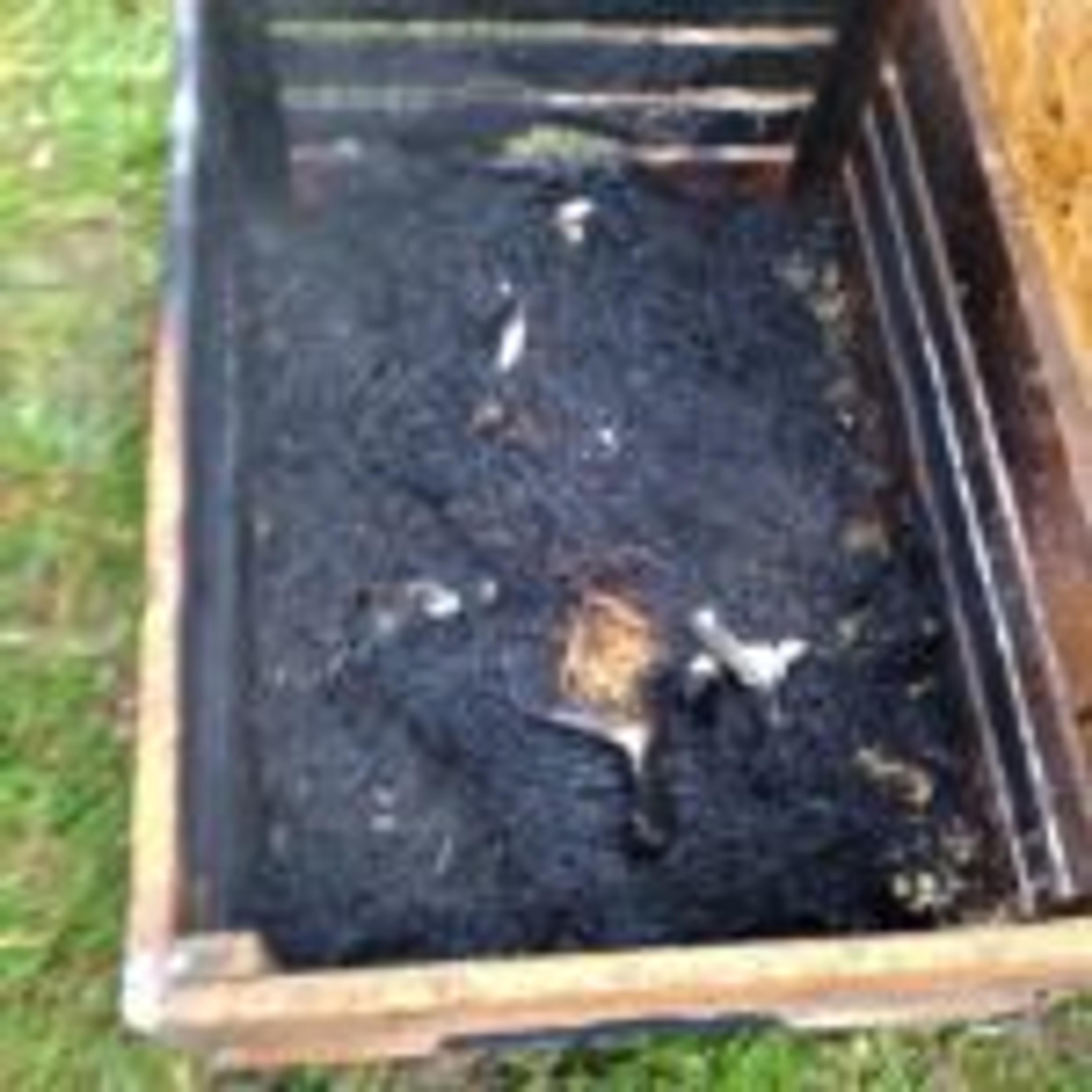 KUNNE ENDT VERRE: Denne kassen brant godt før det ble slokka og kassen ble båret ut av hønsehuset. Foto: VIB.