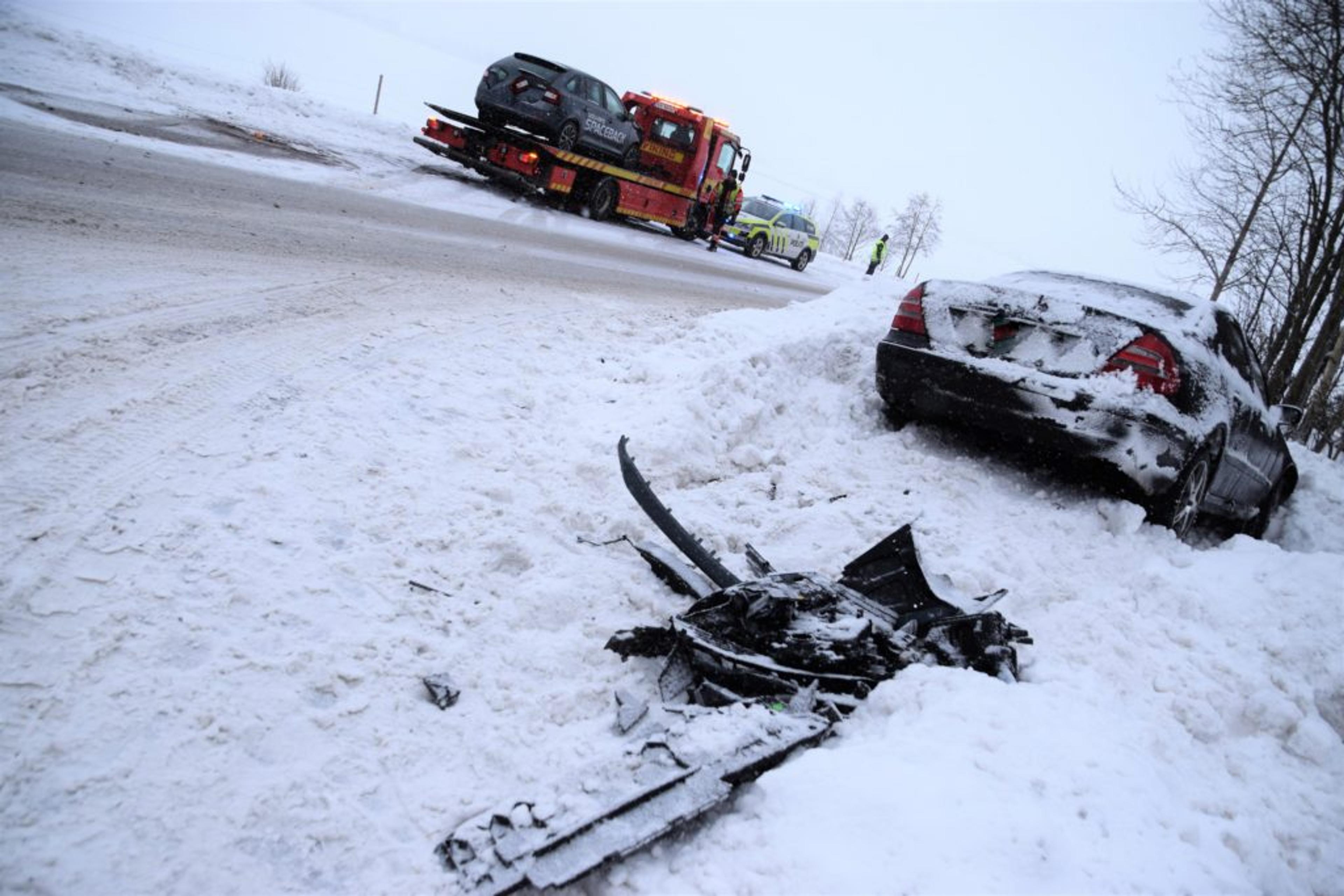 VRAKDELER: To personer blir kjørt til sjukehus etter den kraftige kollisjonen, som vrakdeler vitner om. Foto: Stian Ormestad.