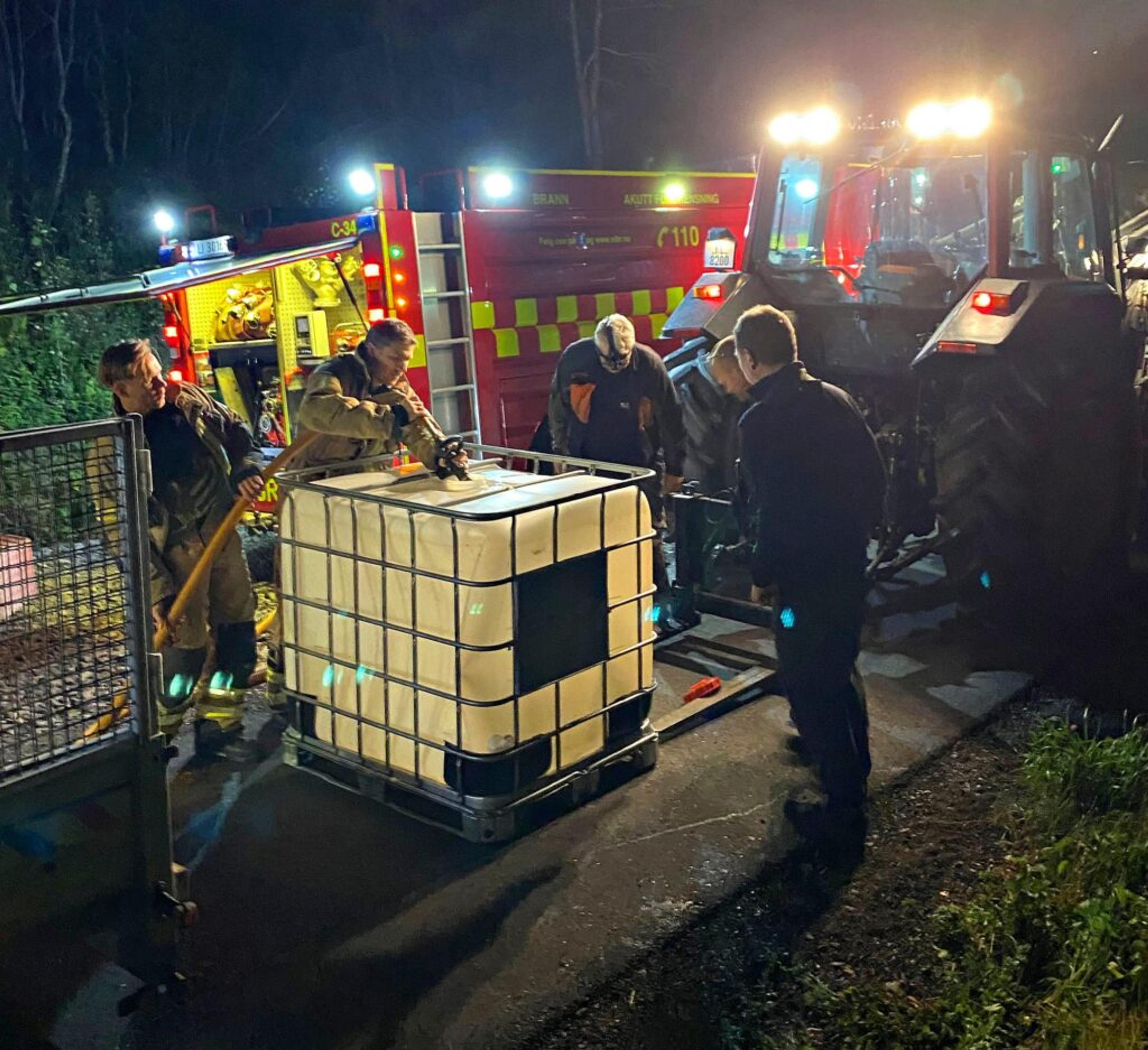 GOD HJELP: En lokal helt med traktor sørger for ny vannforsyning til slokking. Foto: VIB.
