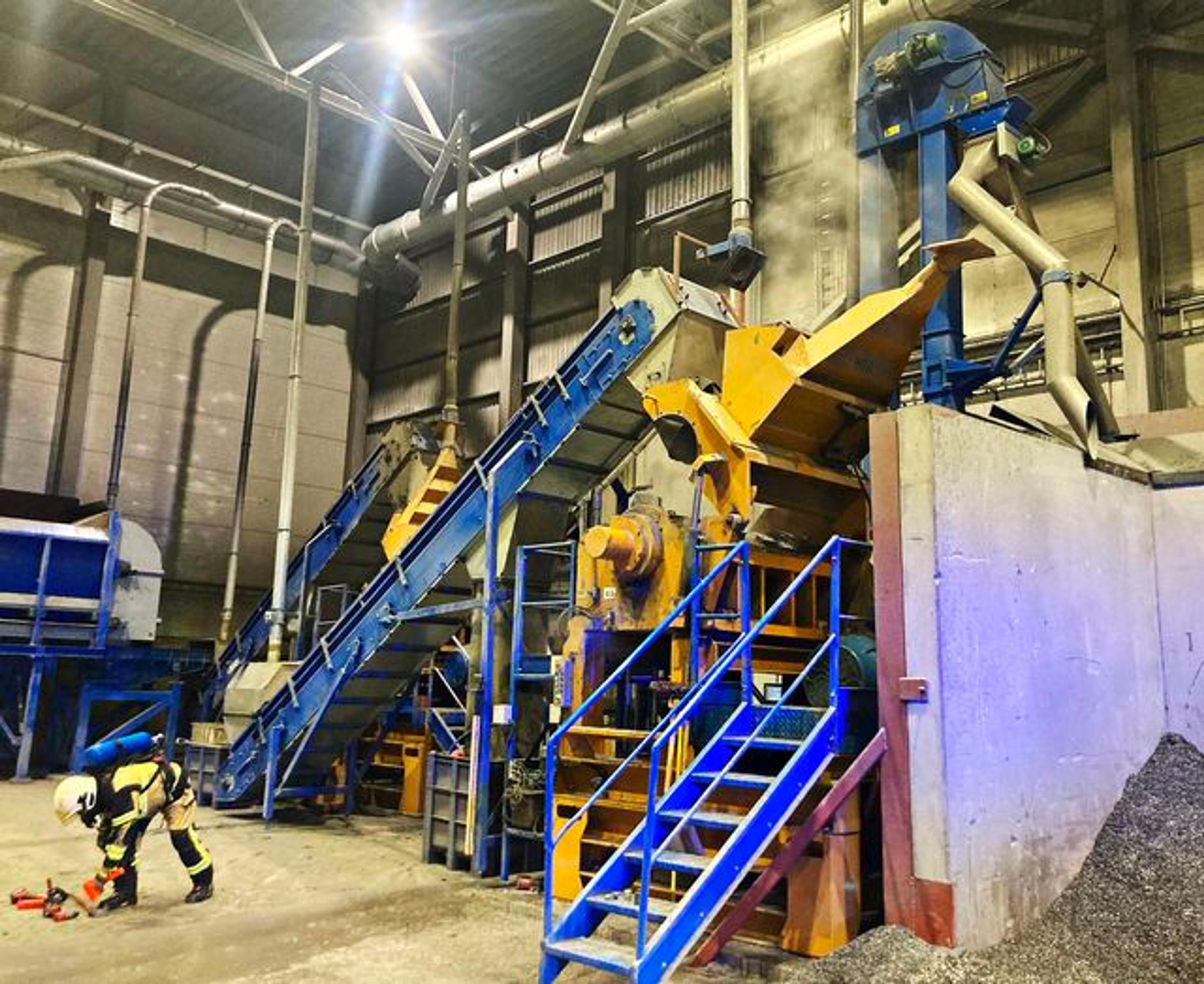 GOD KONTROLL: – Kun litt røykutvikling fra siloen ved et transportbånd. Ingen åpne flammer. Det melder brannvesenet ved sin ankomst. Ansatte på stedet starta slokking før brannmannskap kom til næringsbygget i Re. Foto: VIB.