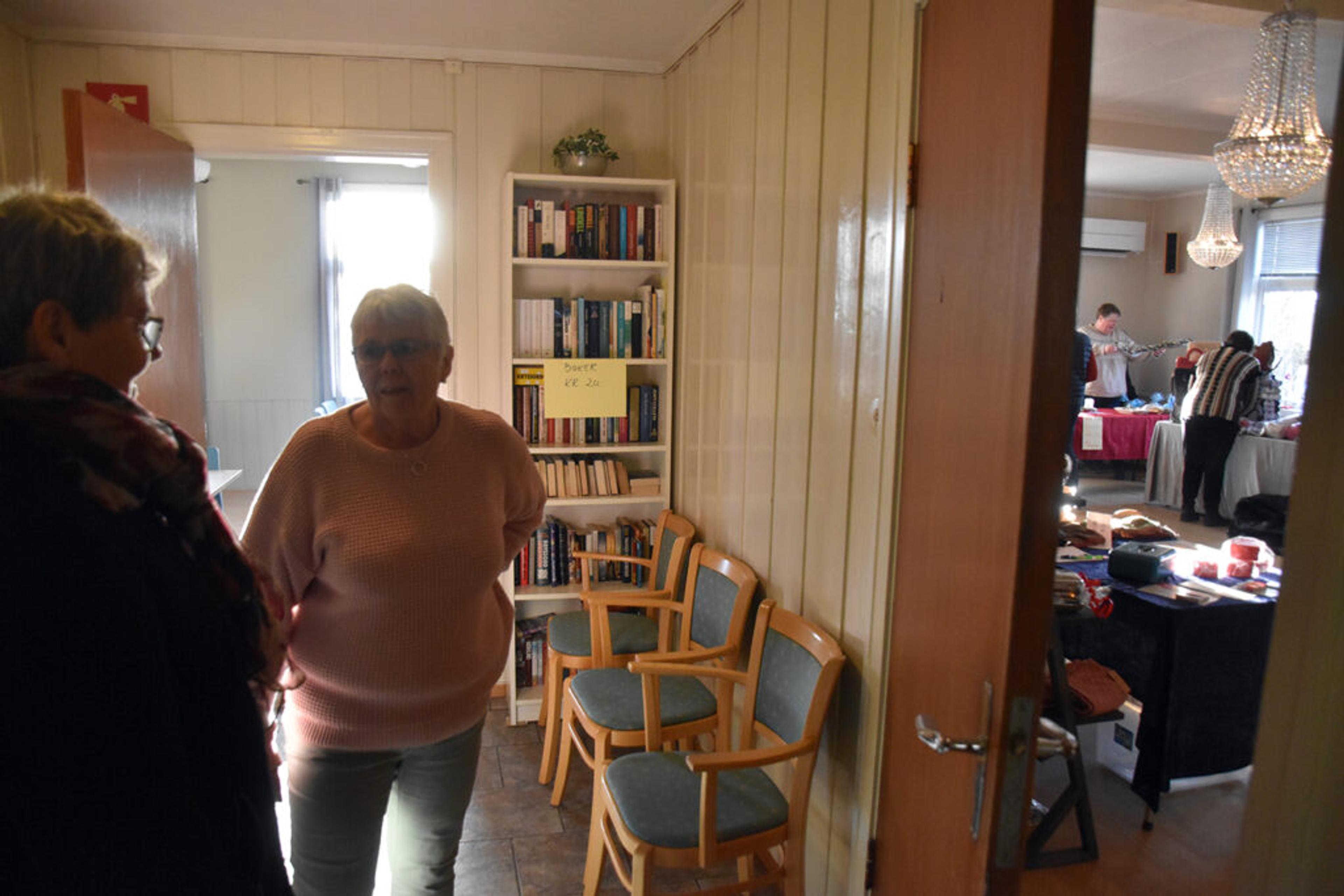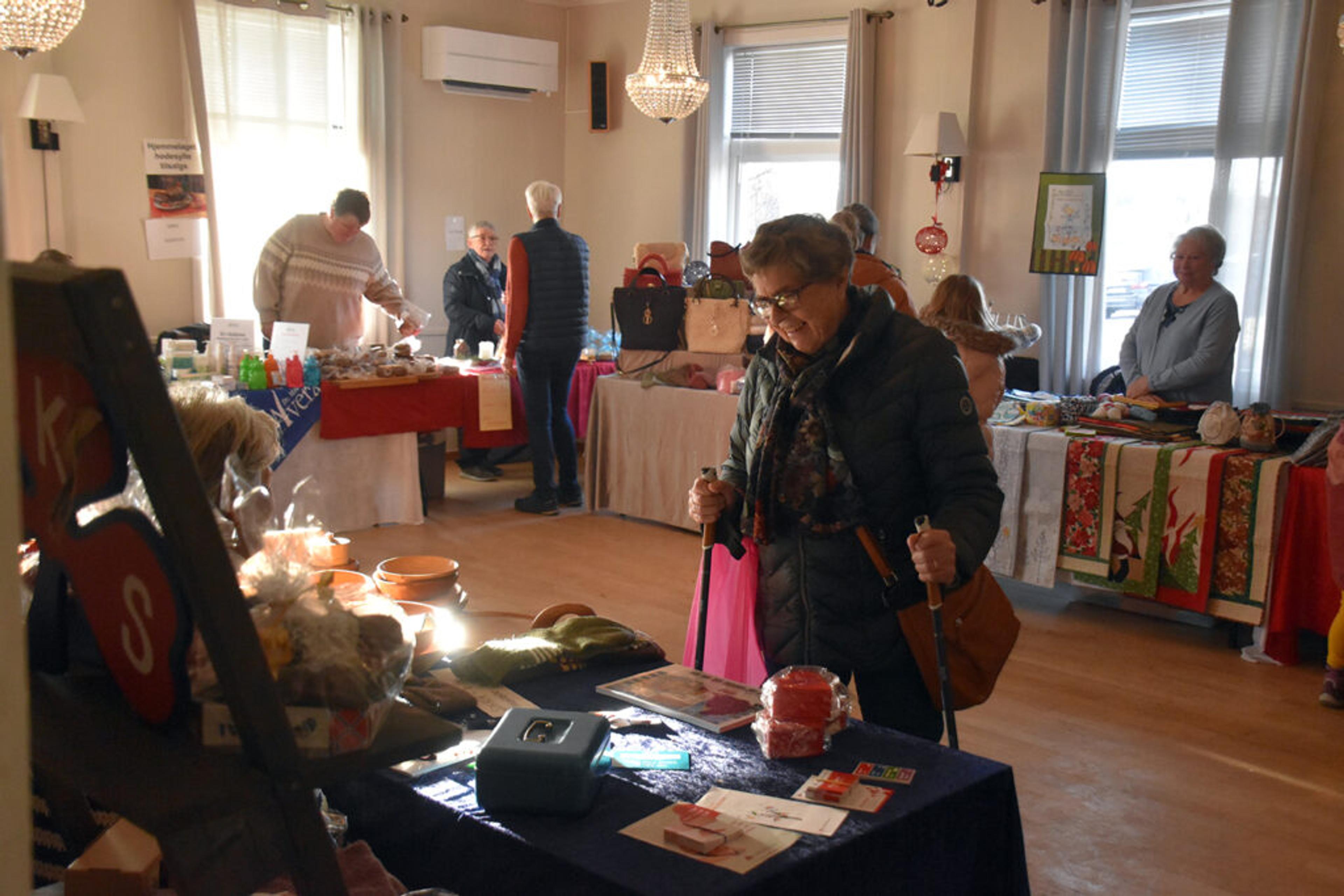 SOSIALT: En av tre viktige inntektskilder for saniteten, men også en viktig møteplass, forteller Anne Lise Skaug, leder i Hjerpetjønn sanitetsforening, om Salgsmesse på Hjerpetjønn vel i dag lørdag 18. november 2023. Foto: Stian Ormestad, ReAvisa.