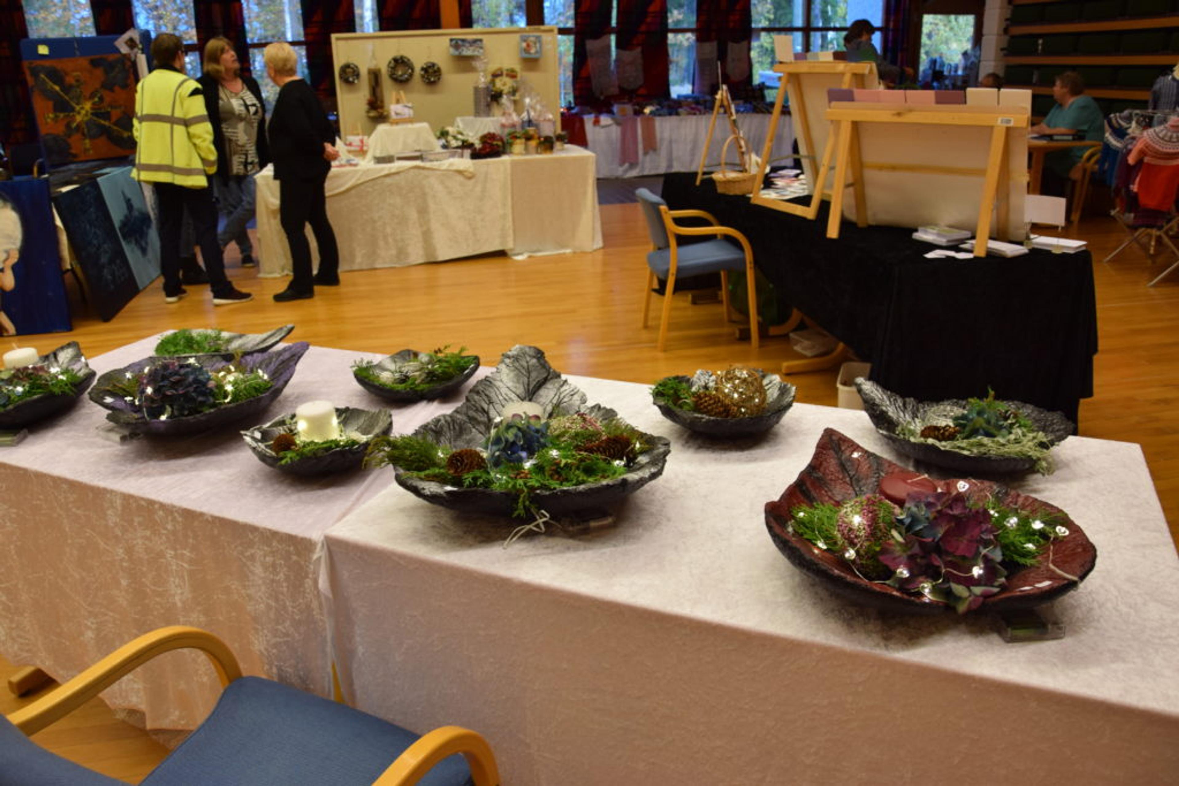 STORSALEN: Våle samfunnshus er fylt med salgsartikler fra de 25 medlemmene i «Våle farge og fantasi». Her rigges det til messe fredag ettermiddag. Foto: Håkon Westby.