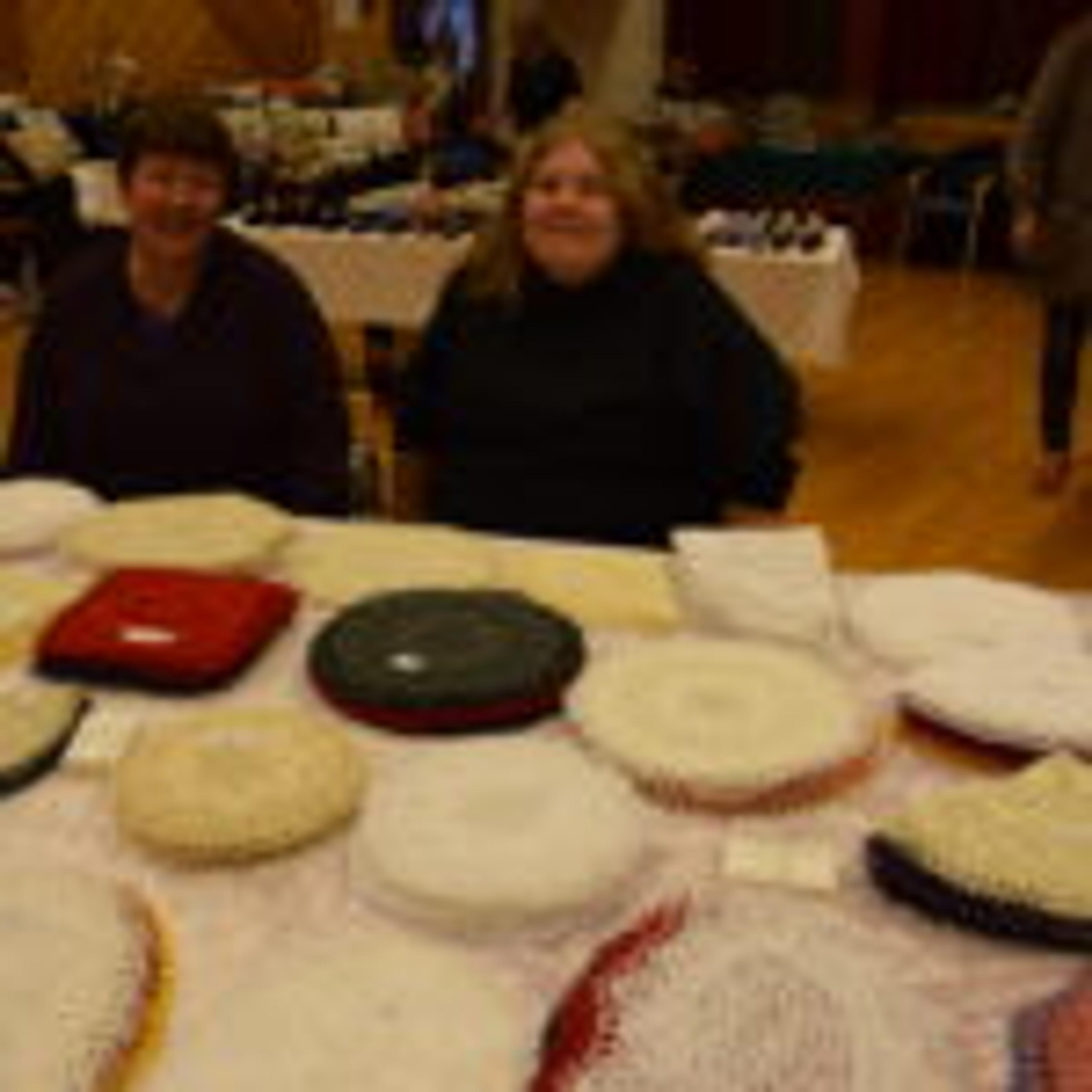 Ved et bord fant vi utstilt en mengde brikker i kunststrikk, laga av Alfhild Johansen på Svinevoll. Bak bordet fant vi barnebarnet Karita Bergstrøm og oldebarnet Madelen Bergstrøm som sto for salget.