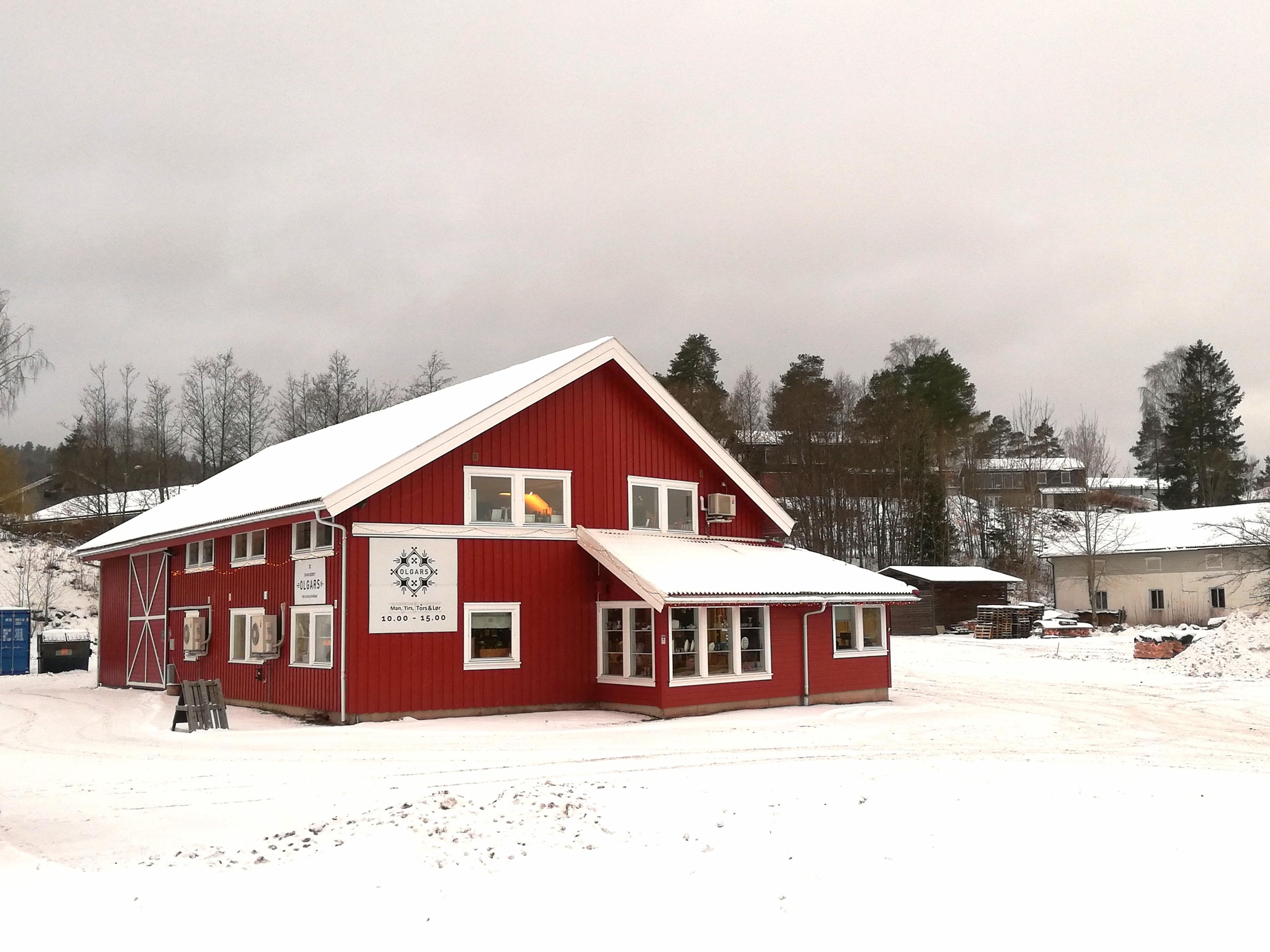 SAMLOKALISERER: Revetal arbeid og kompetanse (RAK) holder til på to adresser i dag, men vil legge all drift til Olgar Dahls vei 1, der RAK allerede har butikken Olgars. Den røde låven vil bli beholdt, og nybygget kommer tilknytning til dagens bygg, i bakkant og i vinkel mot naboen Isomur til høyre på bildet. Foto: Stian Ormestad, ReAvisa.