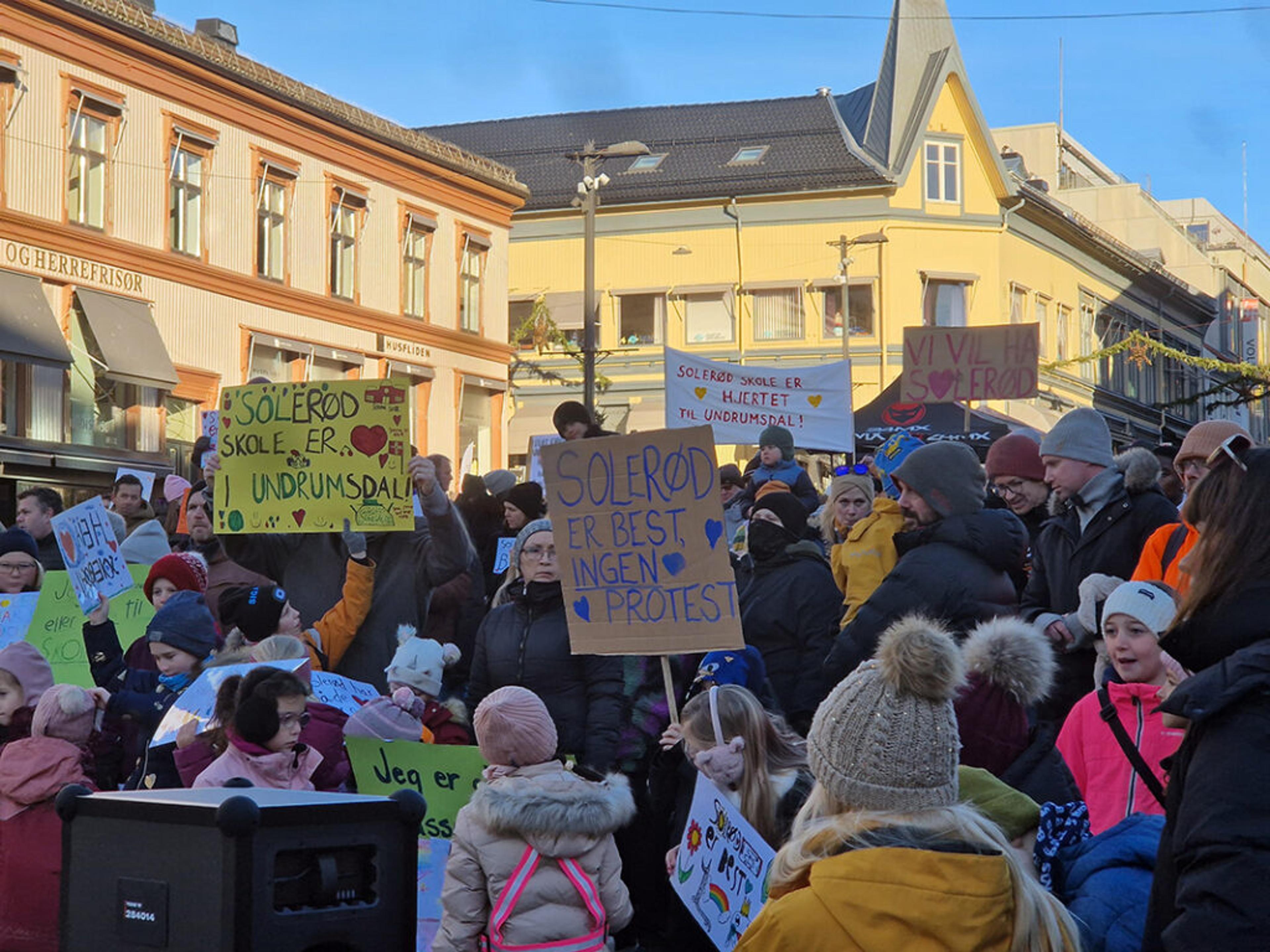 «Solerød er best, ingen protest», er en gjenganger fra tidligere demonstrasjoner for å få beholde skolen – dette er sjette gang skolen er nedleggingstrua. Skolen har runda hundre elever: