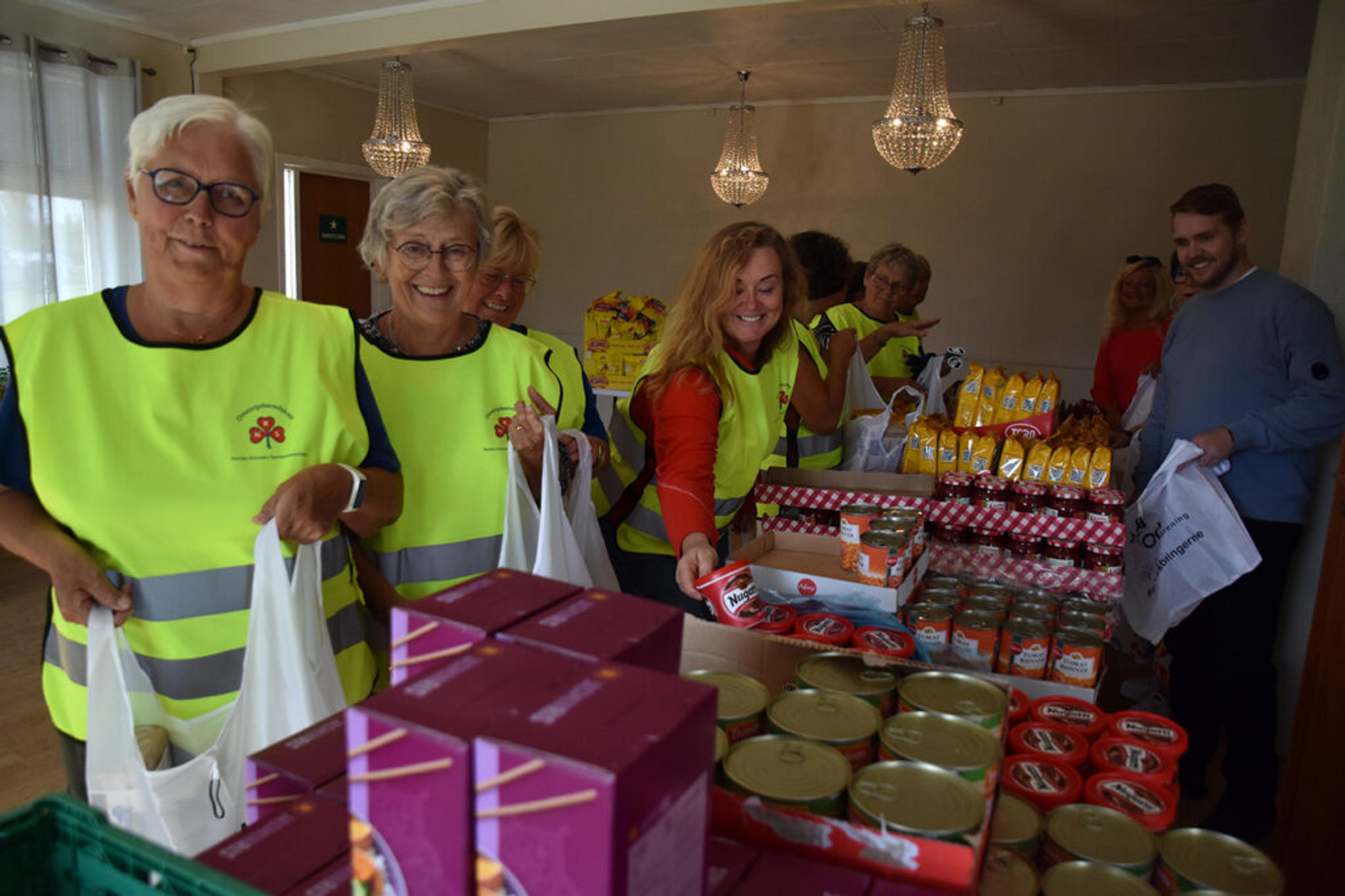 – Dette er damer du kan stole på, sier Anne og smiler til dugnadsgjengen som er i full gang med å fylle posene med mat og mye nyttig.