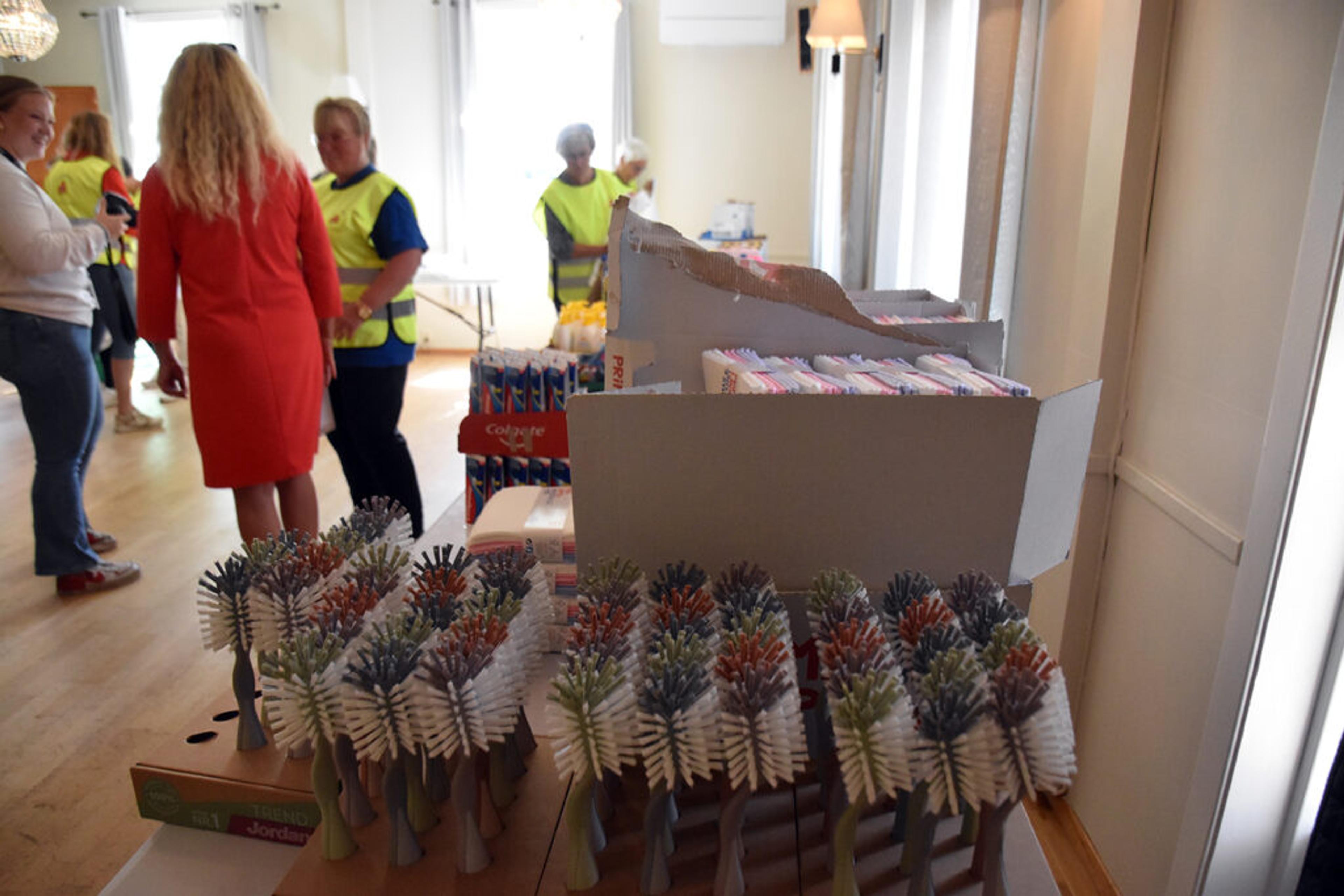 TANNBØRSTER OG SÅPE: Det pakkes i poser til totalt seksti barnefamilier som vil få hjelp gjennom denne dugnaden på Hjerpetjønn vel. Foto: Stian Ormestad, ReAvisa.