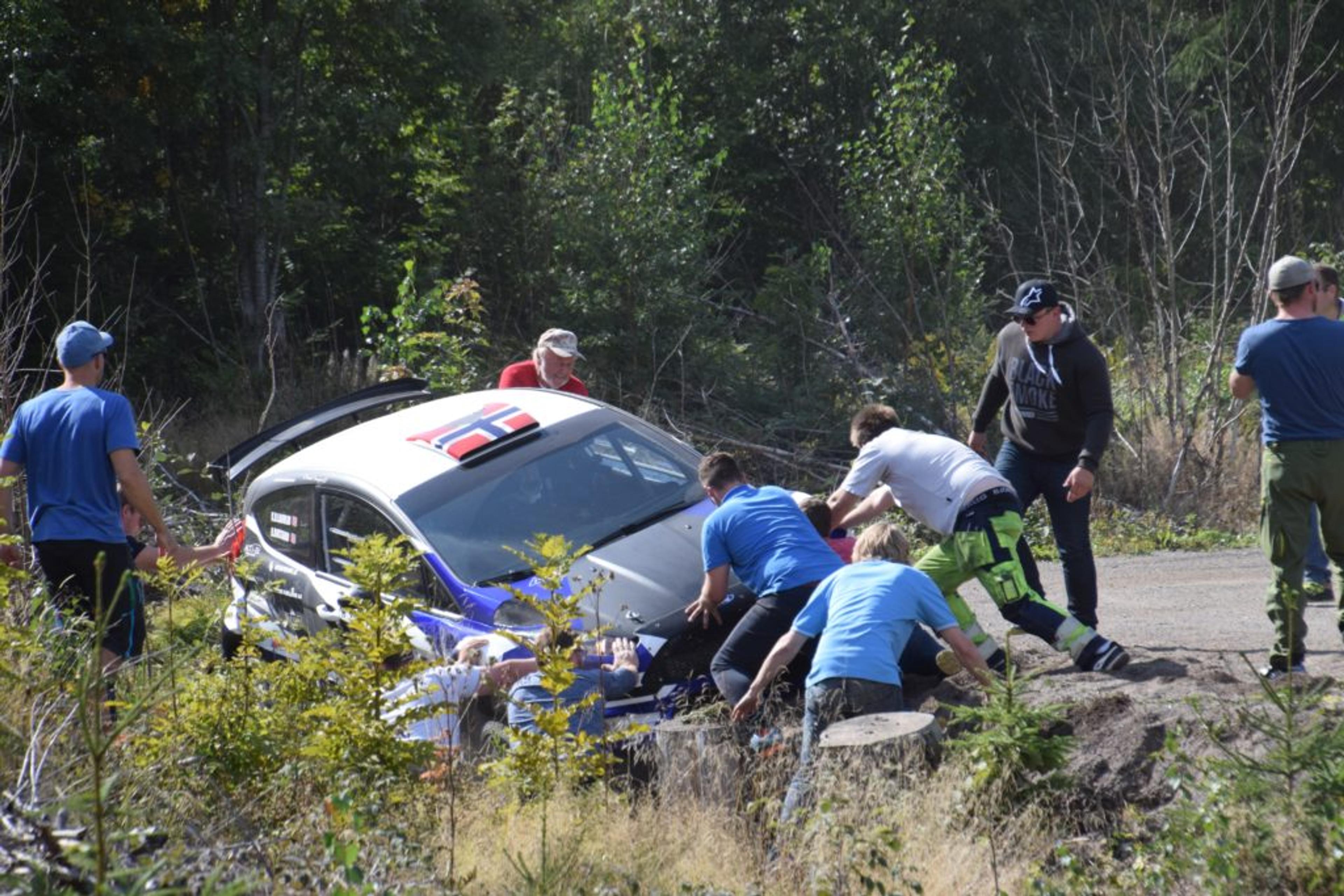 BOM FAST: Roger Rustand fra Kongsberg fikk hilse på litt flott Re-natur da veien plutselig ble borte under rallybilen. Foto: Stian Ormestad.