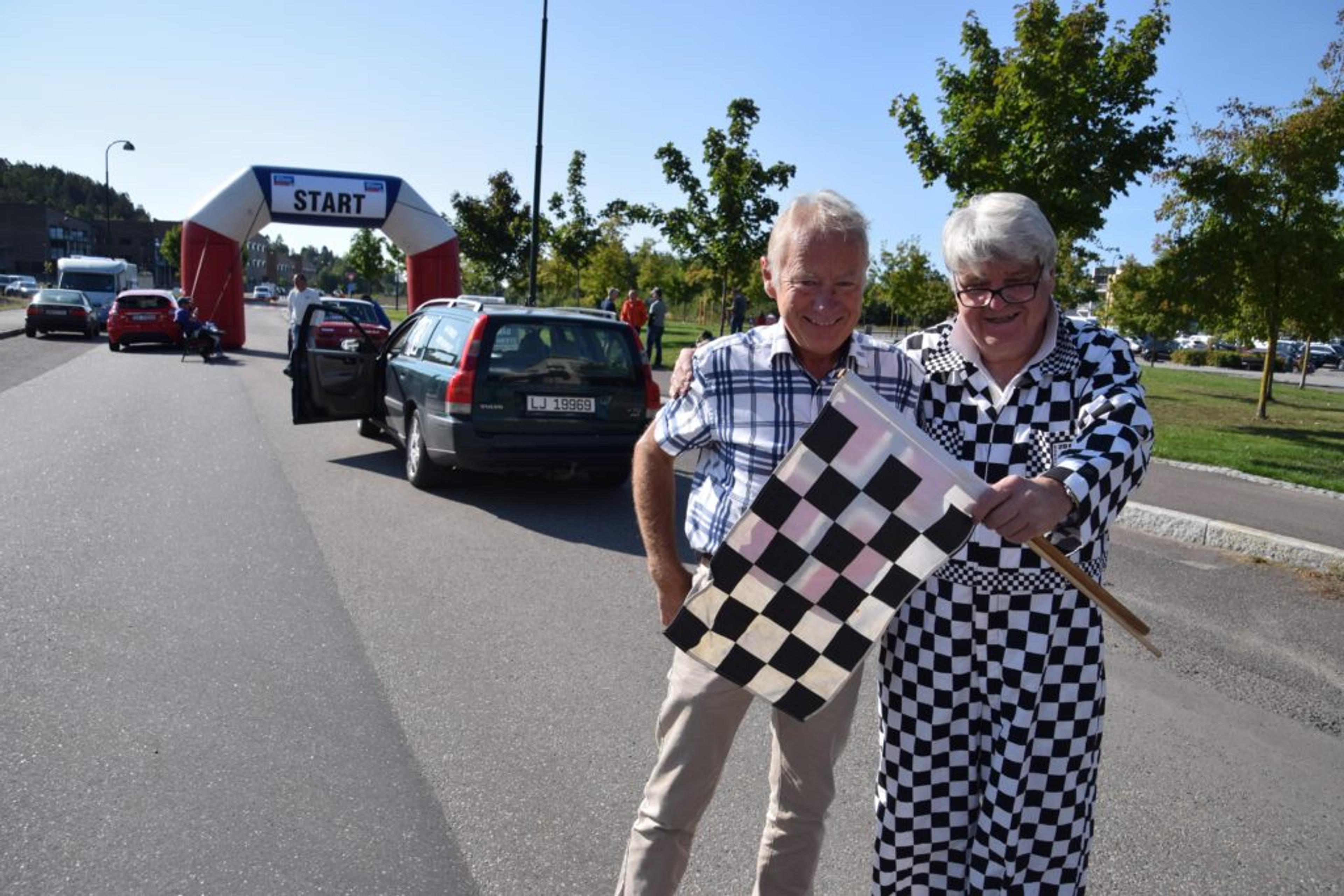 THORVALD MED MÅLFLAGGET: Re-ordfører Thorvald Hillestad stiller opp som både starter og målmann sammen med Vidar Holum fra arrangøren Asker og Bærum motorsport. Thorvald skulle gjerne prøvd seg mot norgeseliten med sin Tesla. Foto: Stian Ormestad.