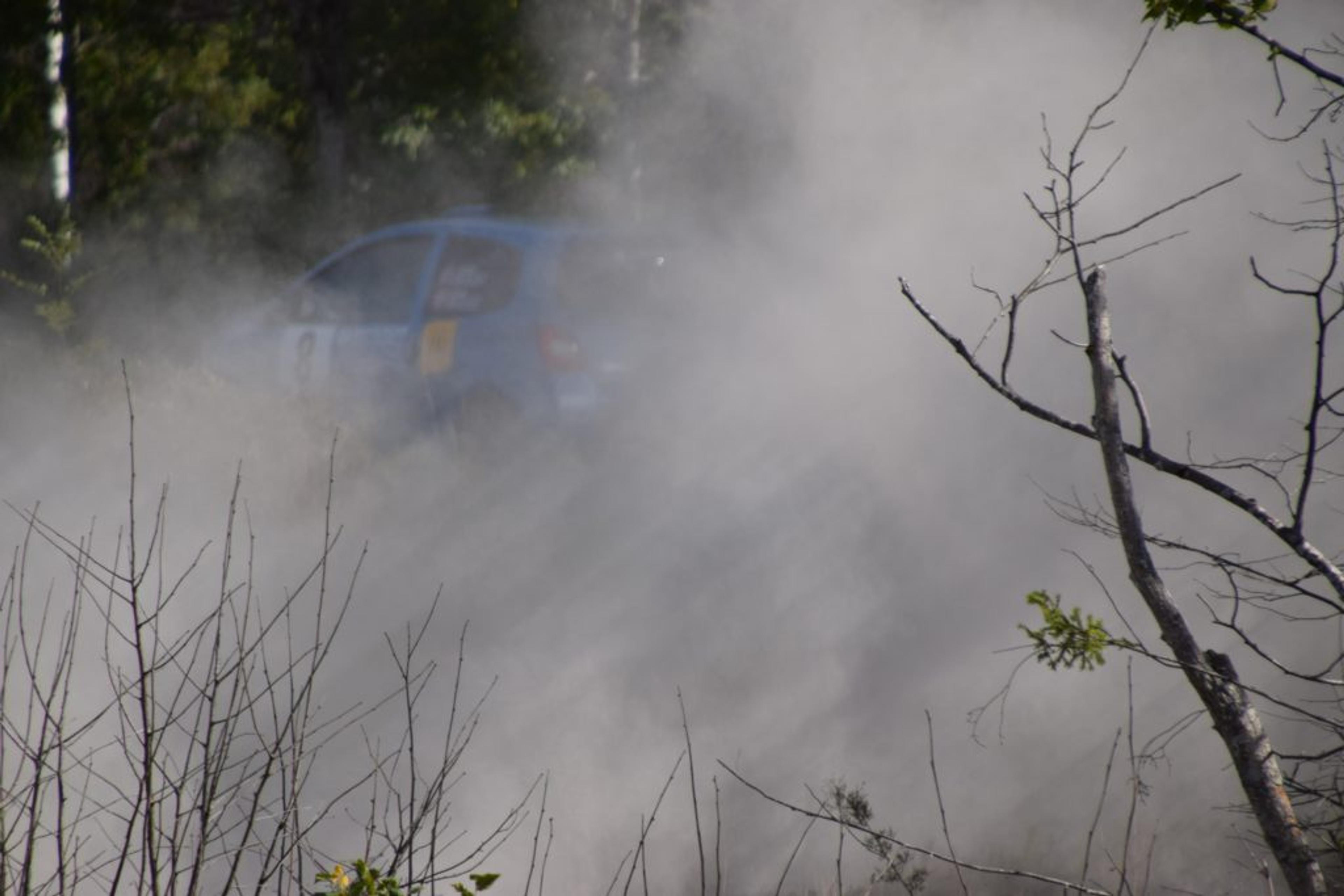 DÅRLIG SIKT: En rallybil kommer gjennom skogen med panseret rett til værs… Foto: Stian Ormestad.