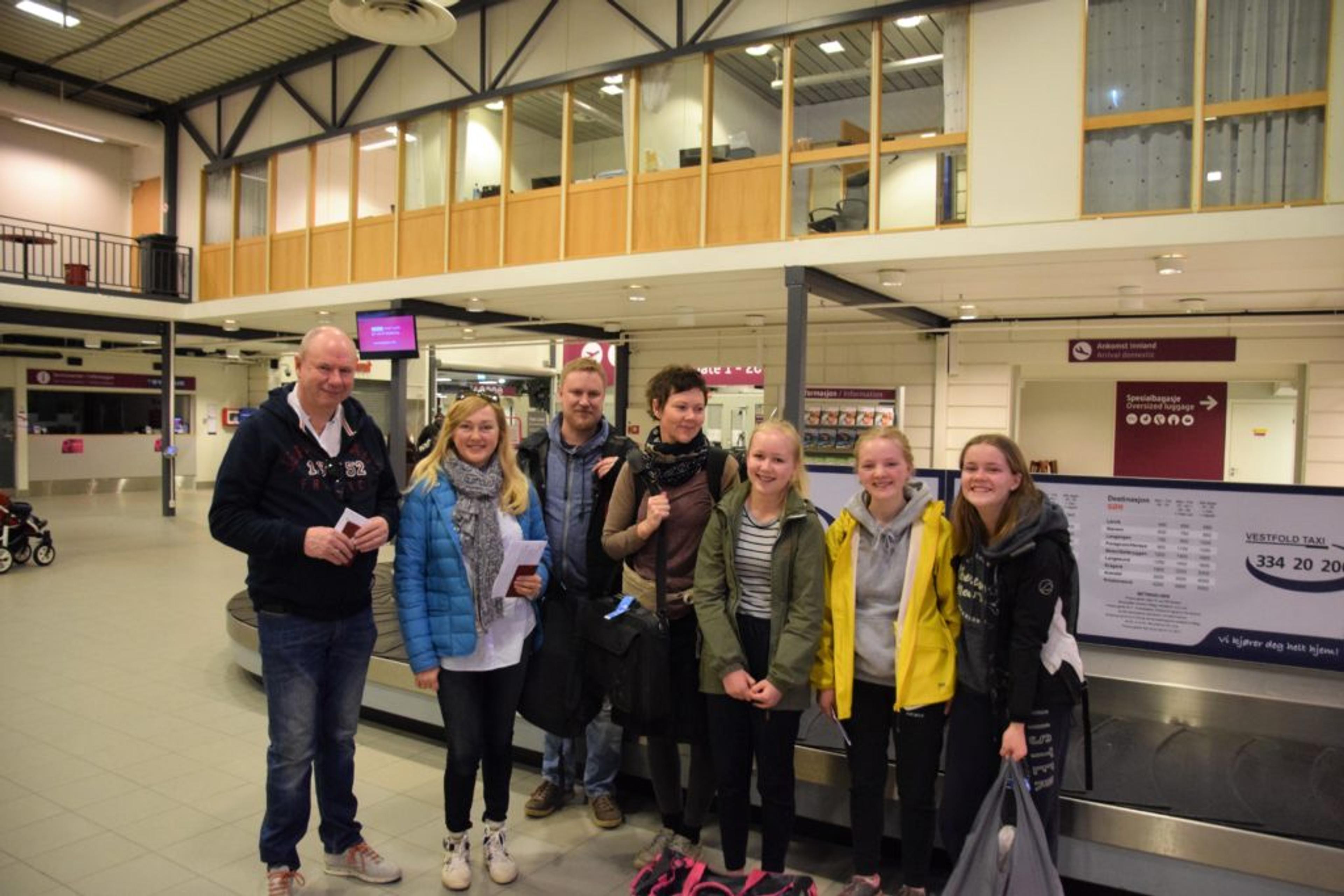 DELEGASJON: Disse sju reiser til Katwe, fra høyre: Lene Sofie og Selma, elever ved Revetal ungdomsskole, Amalie, elev ved Andebu ungdomsskole, Monica og Olga, lærere ved Revetal ungdomsskole. Helt til venstre Olgas mann Bjørn, og bak Stian i ReAvisa. Foto: Erik Myrvang.