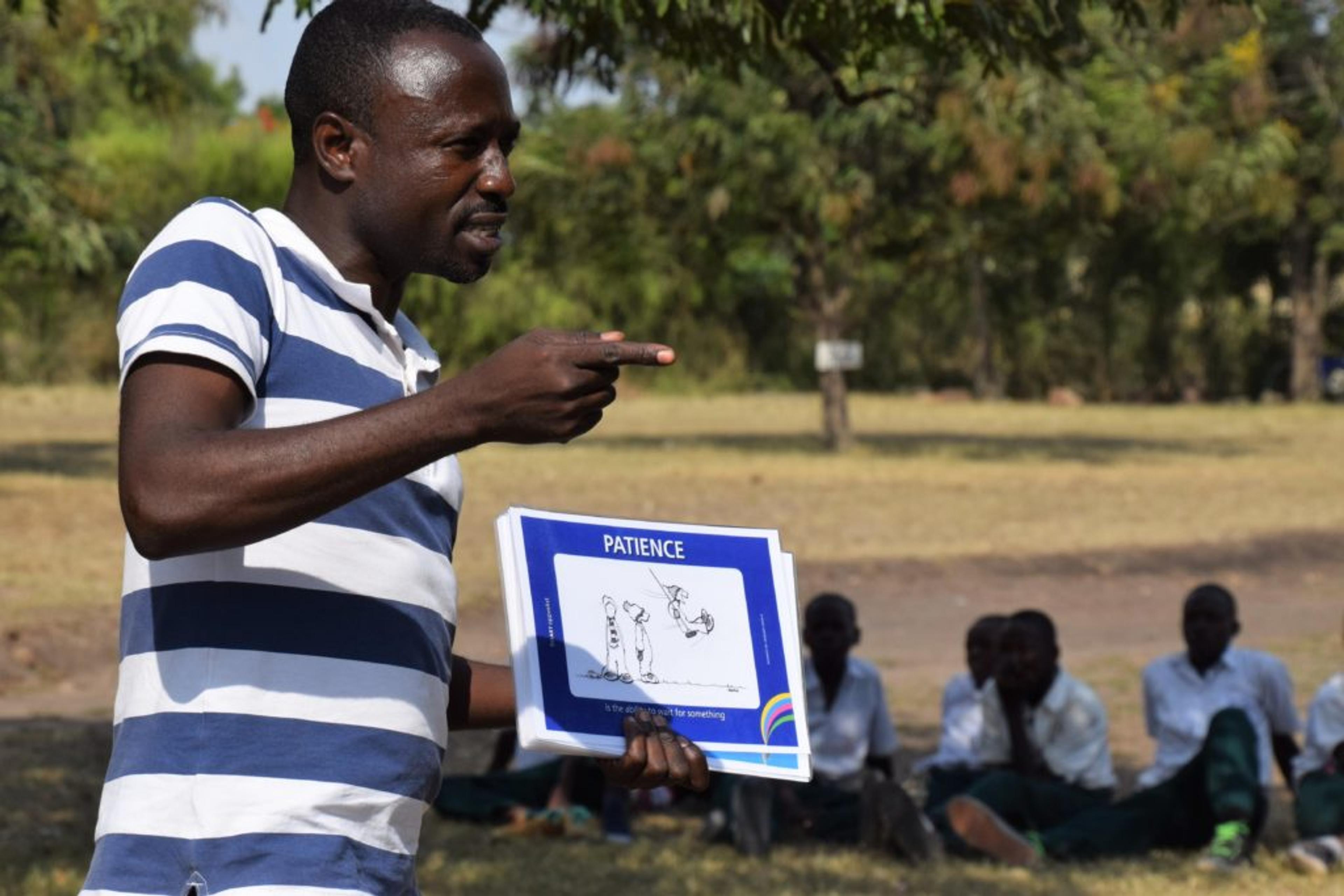 SMART OPPVEKST: Henry Kabiriri, som jobba som lærer i Re ett år som en del av utvekslingsprogrammet, har fått overlevert smart-kort som Revetal ungdomsskole-lærerne har printa ut og laminert – og han er kjapt i gang med å bruke dem. Foto: Stian Ormestad.