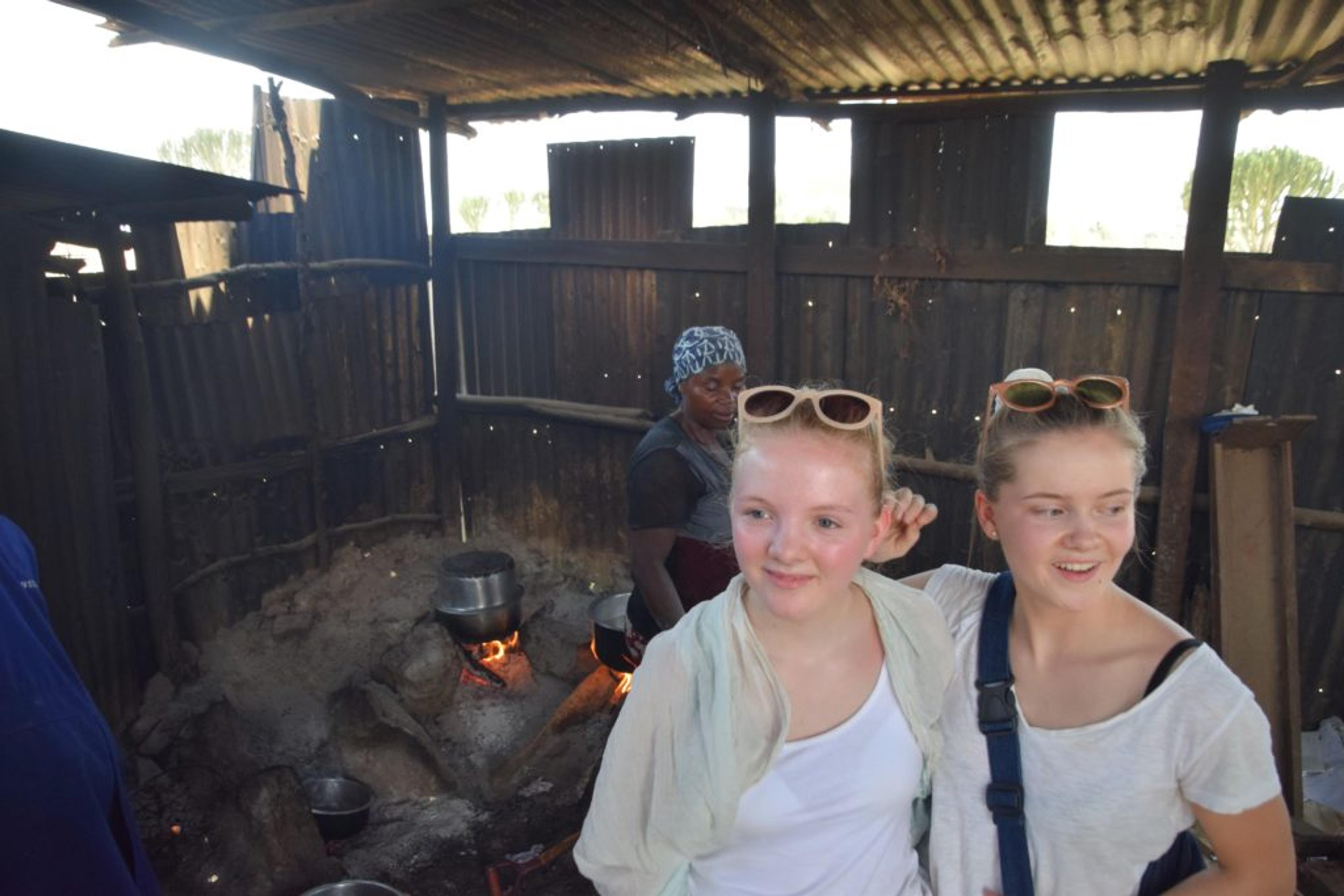 RØYKFYLLT: Selma og Lene Sofie i skolekjøkkenet som er veldig røykfylt. Pengene fra Katwe-dagen skal blant annet gå til ei pipe her. Foto: Stian Ormestad.