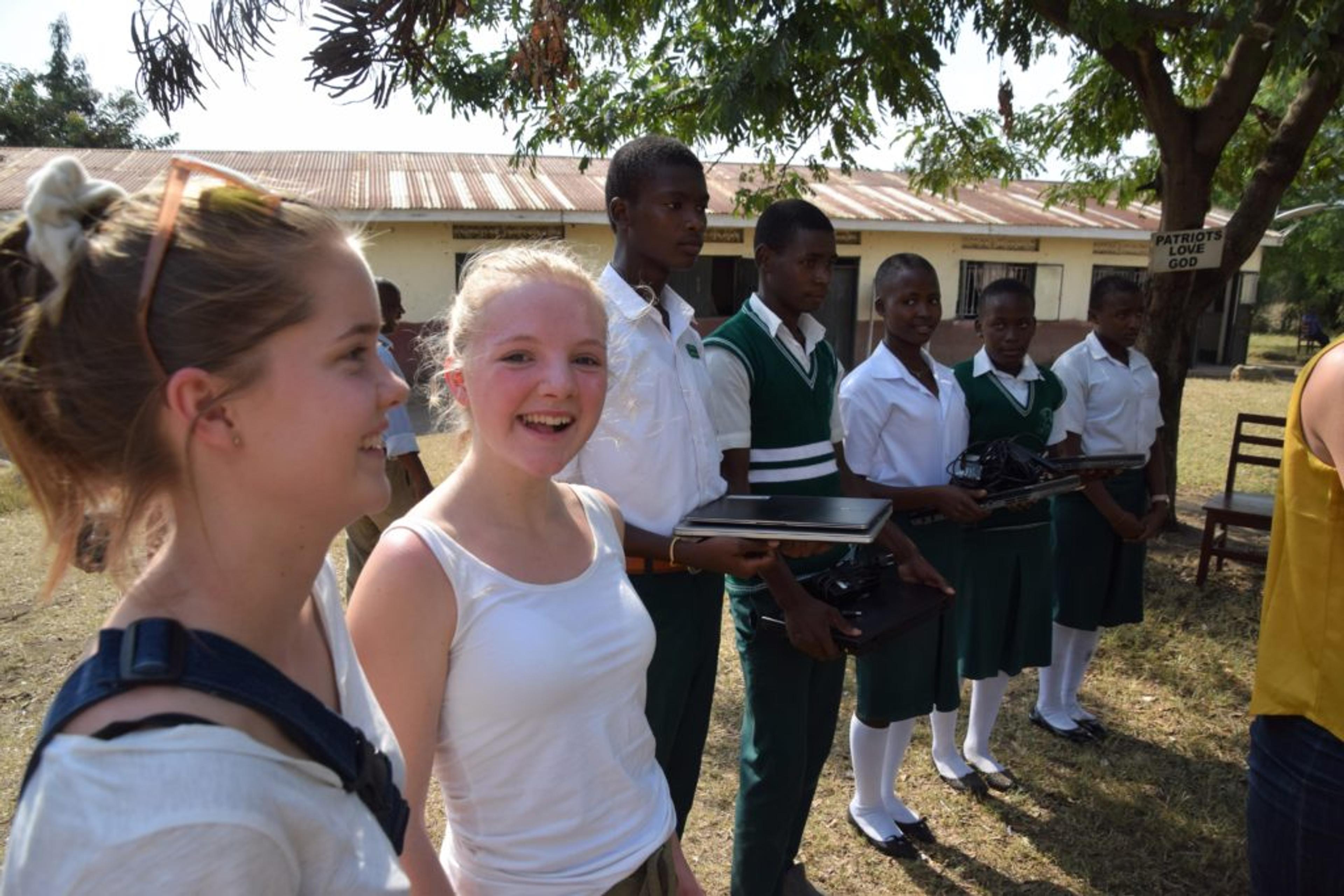 SKOLEBESØK: Elevene ved Katwe secondary school får her overlevert PC-ene som elevene på Revetal ungdomsskole har samla inn. Skolen med 200 elever har bare to PC-er på deling fra før av. Foto: Stian Ormestad.