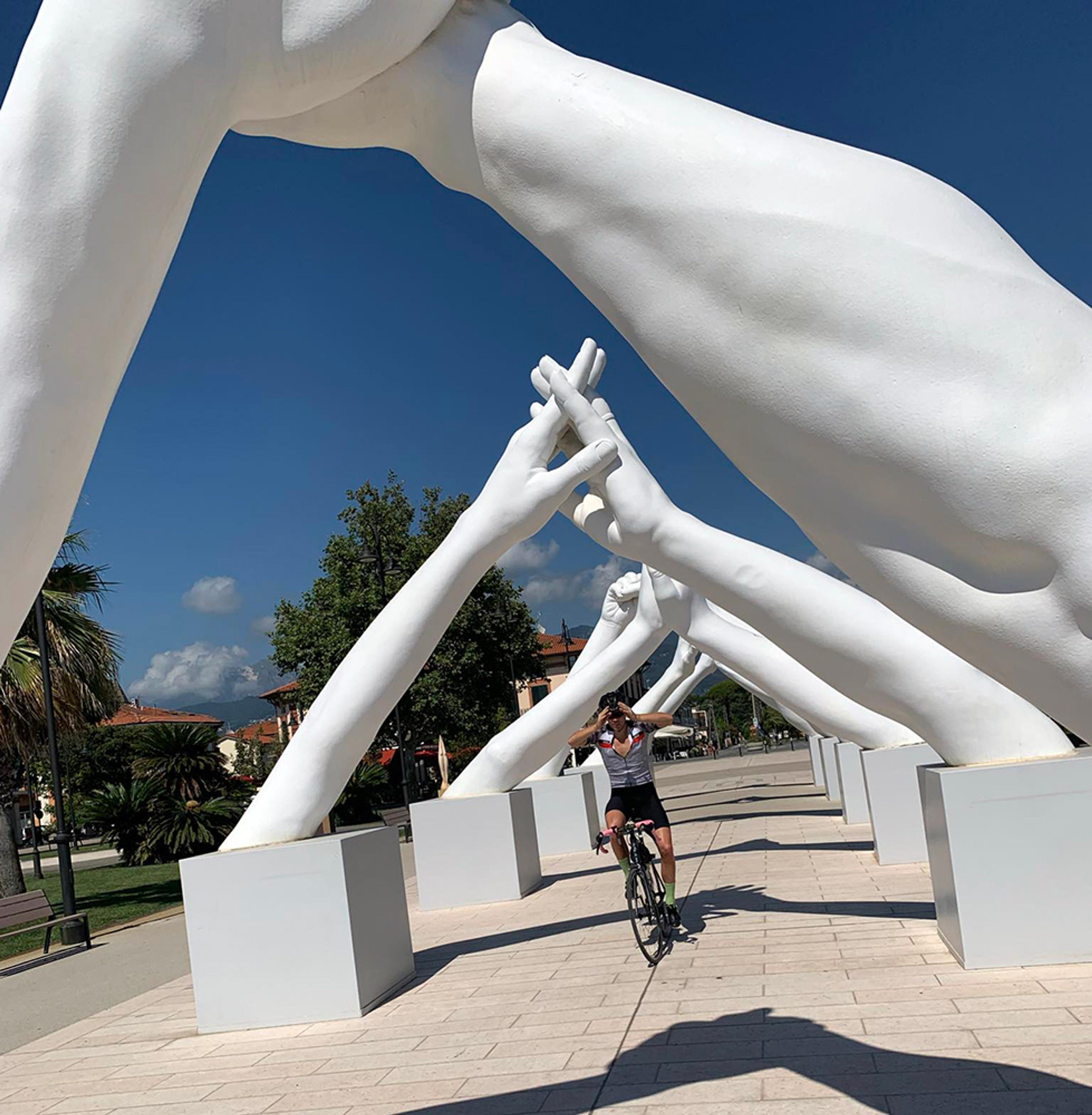 Vi skrudde dem sammen og spiste litt italienske bakevarer før vi trilla av gårde mot La Spezia etter et kjapt bilde av Det skjeve tårnet. Turen gikk langs strender og veier fulle av folk som skal på stranda.