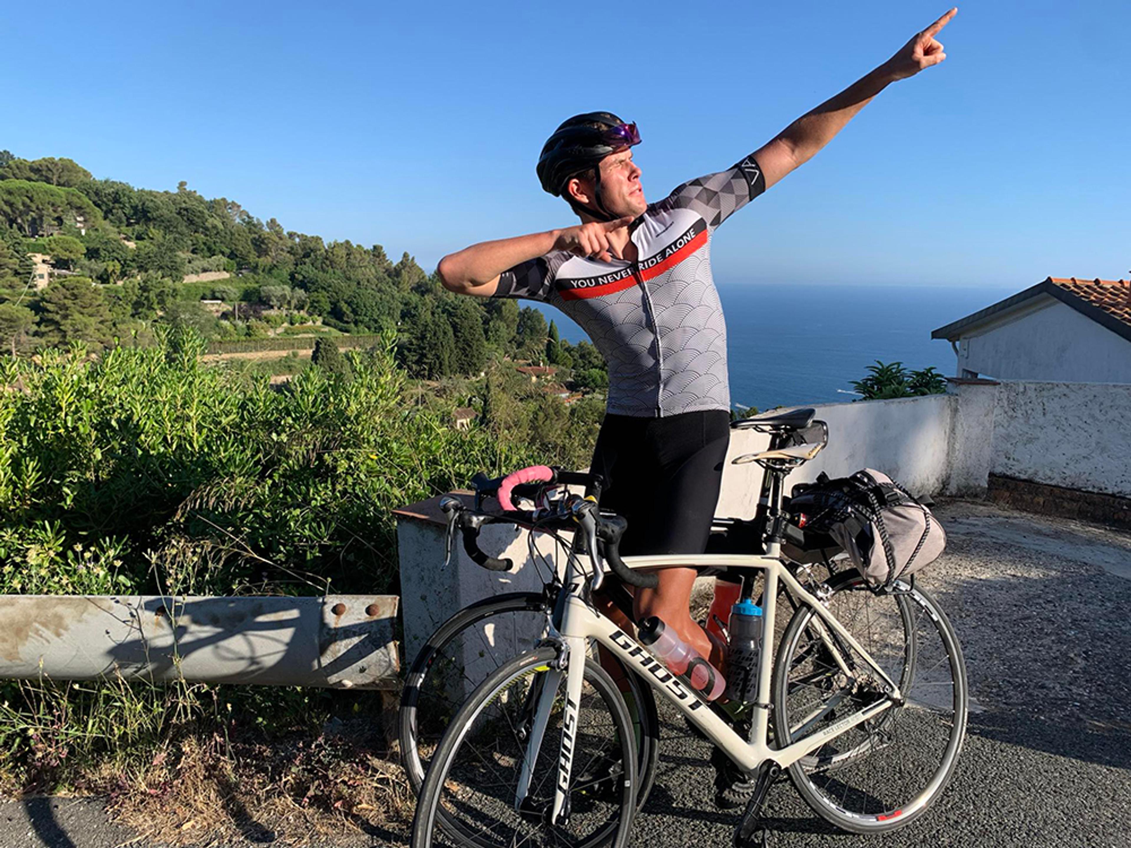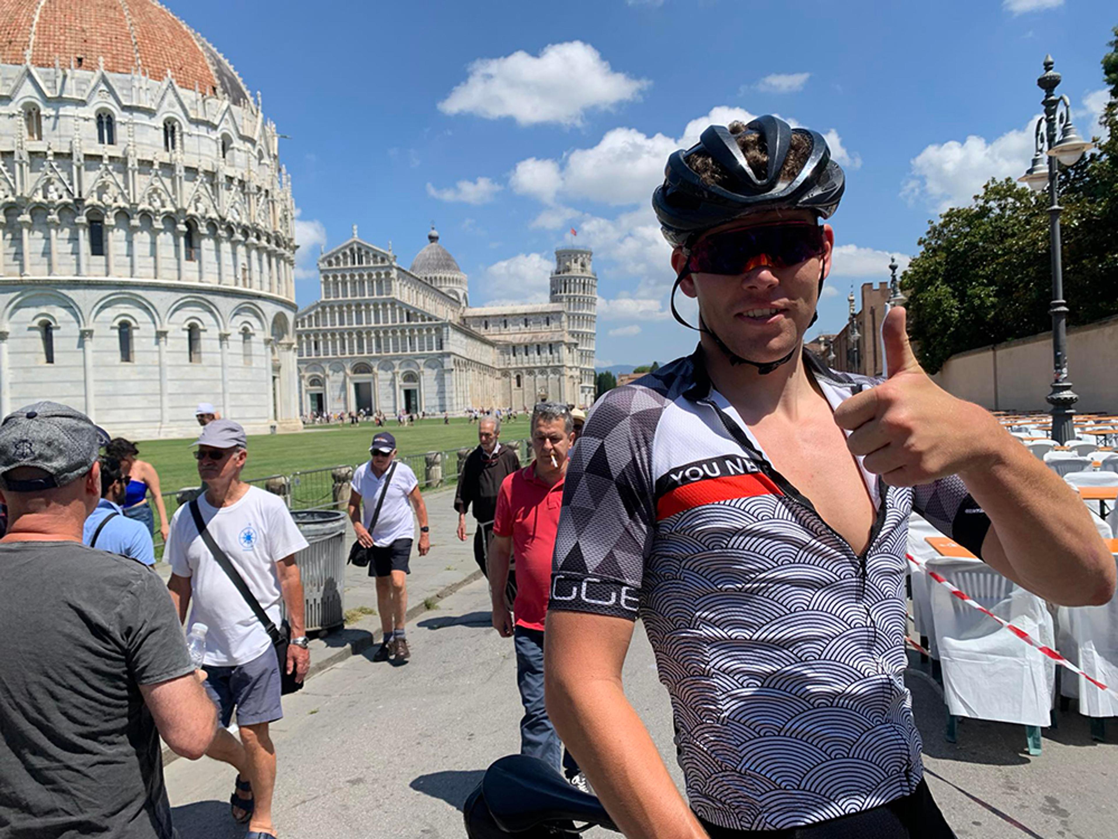 STRAIGHT START FRA DET SKJEVE TÅRN I PIZA: Sebastian klar for avreise i Italia, fotografert av følgesvenn tante på sykkelturen i Europa. Foto: Privat.