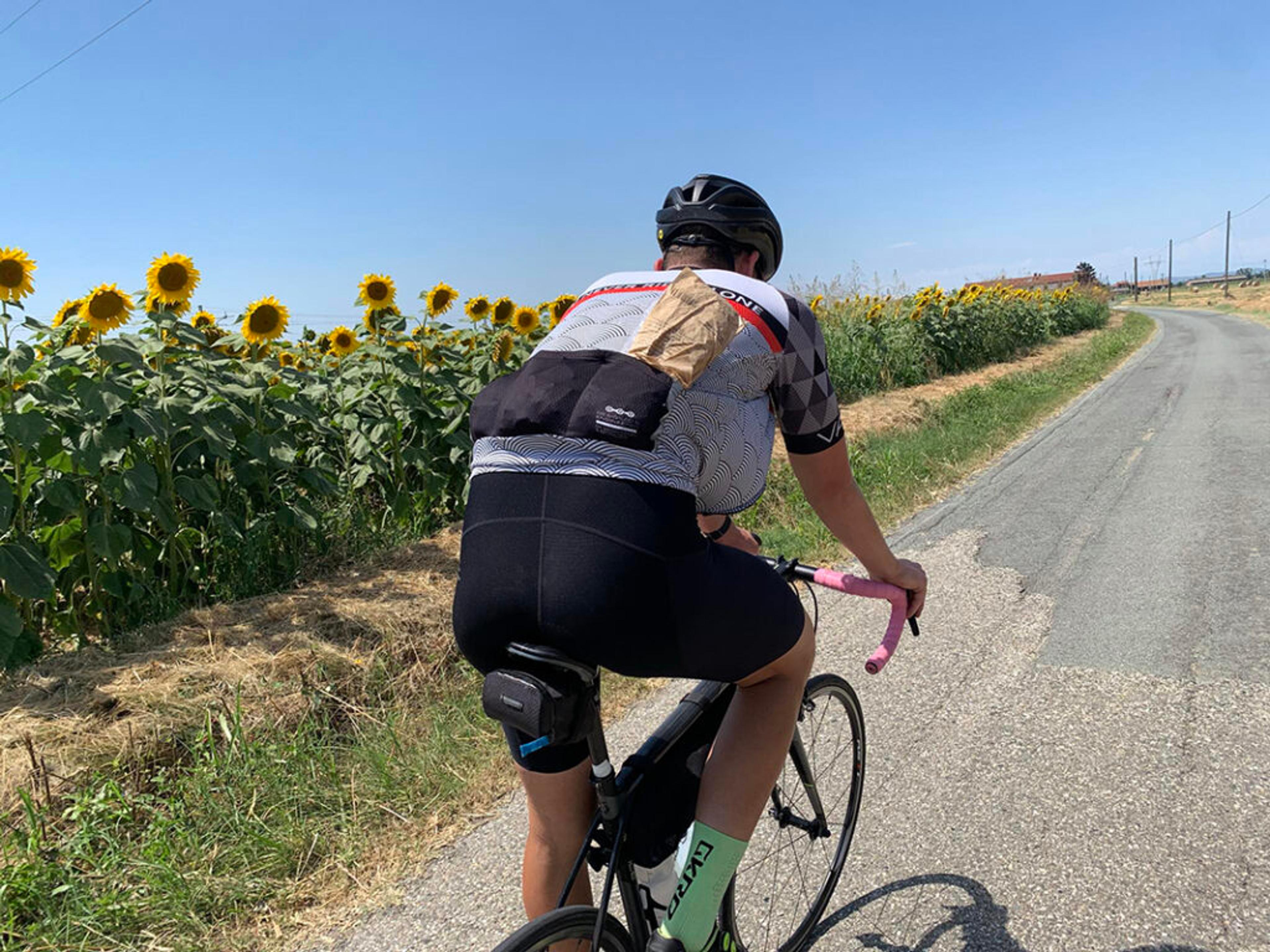 DE ITALIENSKE SLETTENE: Med enorme solsikkeåkre, ryddige drueranker og tresking av korn – allerede. Foto: Privat.