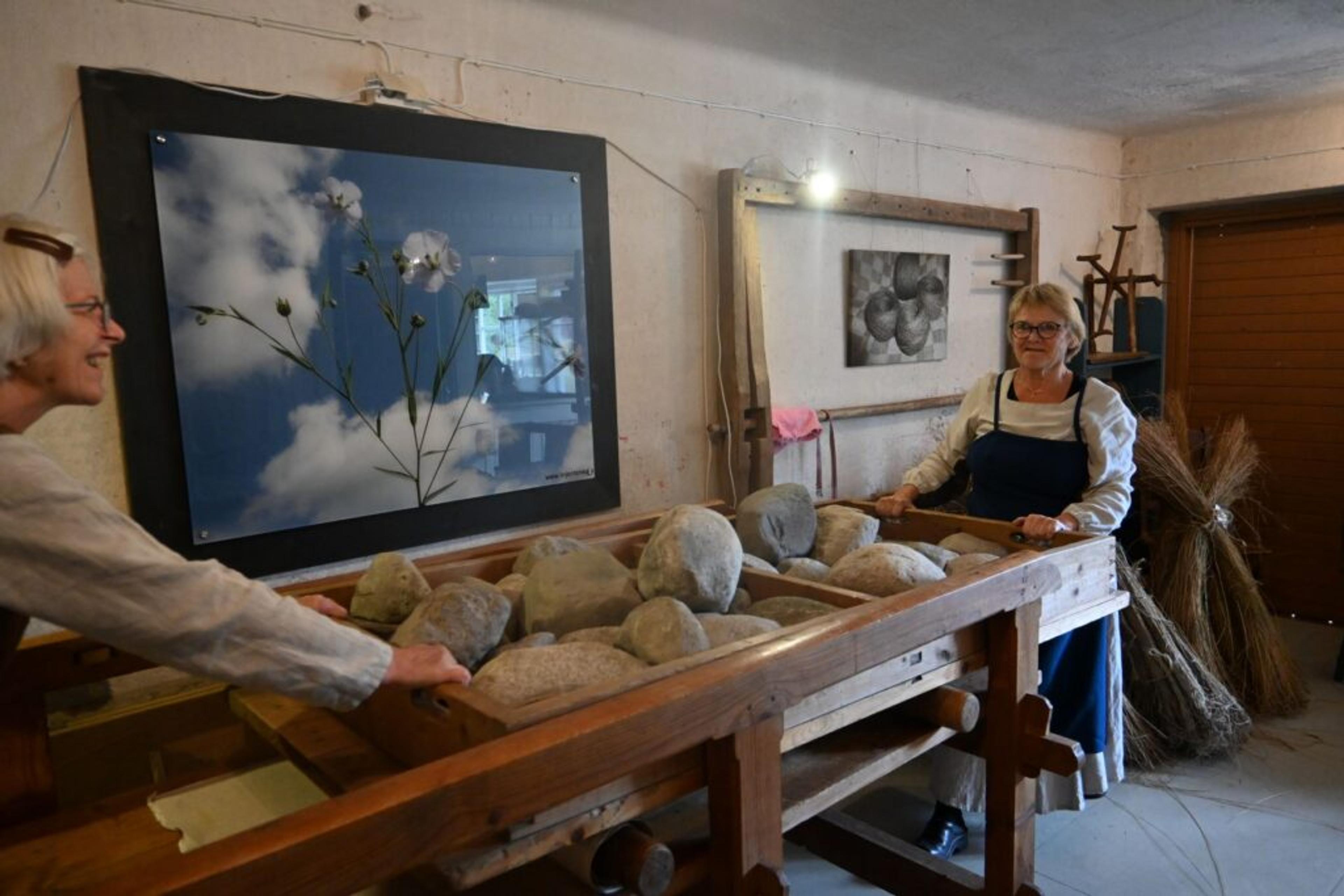– Og dukene må presses på god gammaldags måte. Med hele 400 kilo sjølvplukka stein blir det nesten bedre enn i en vanlig rulle.