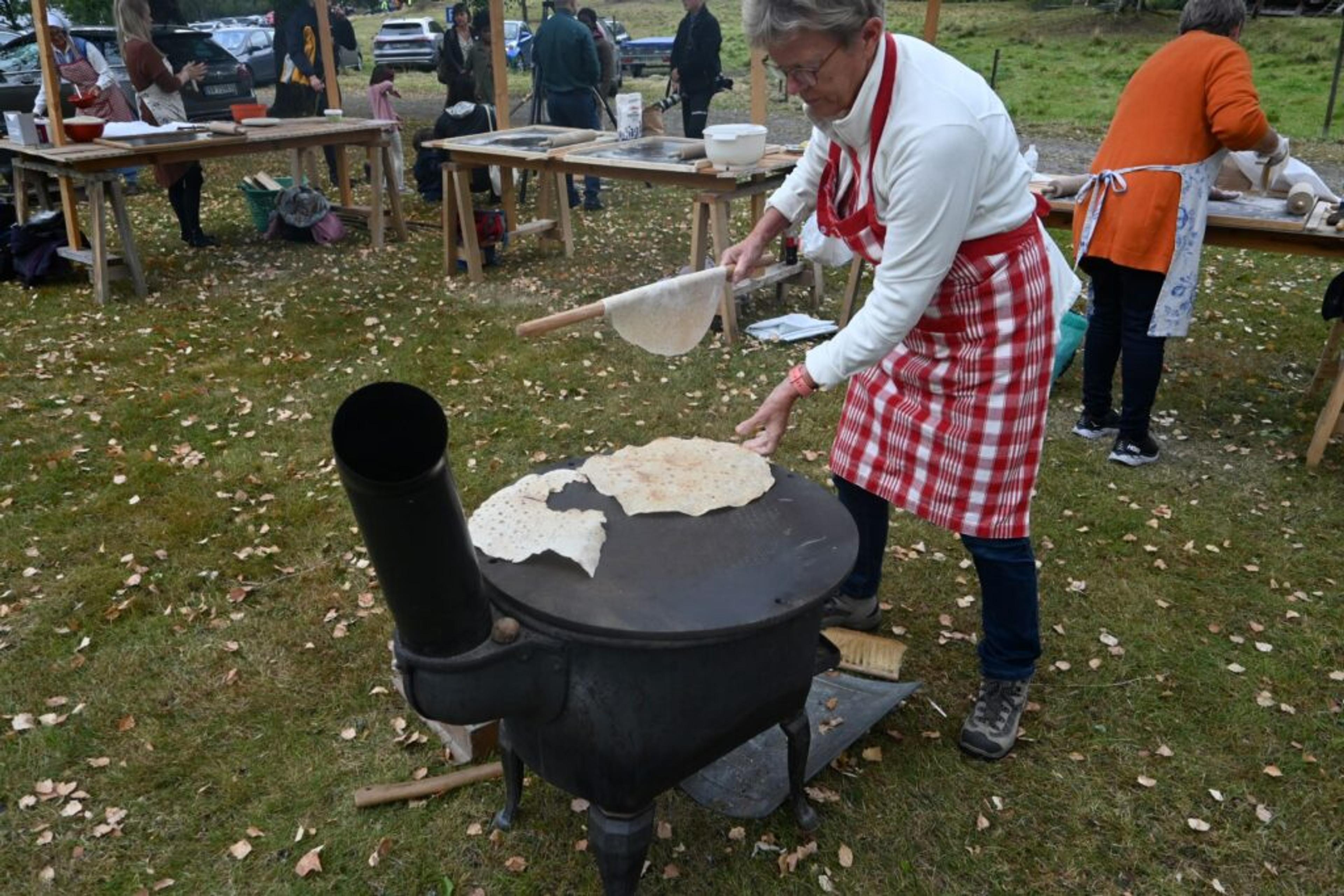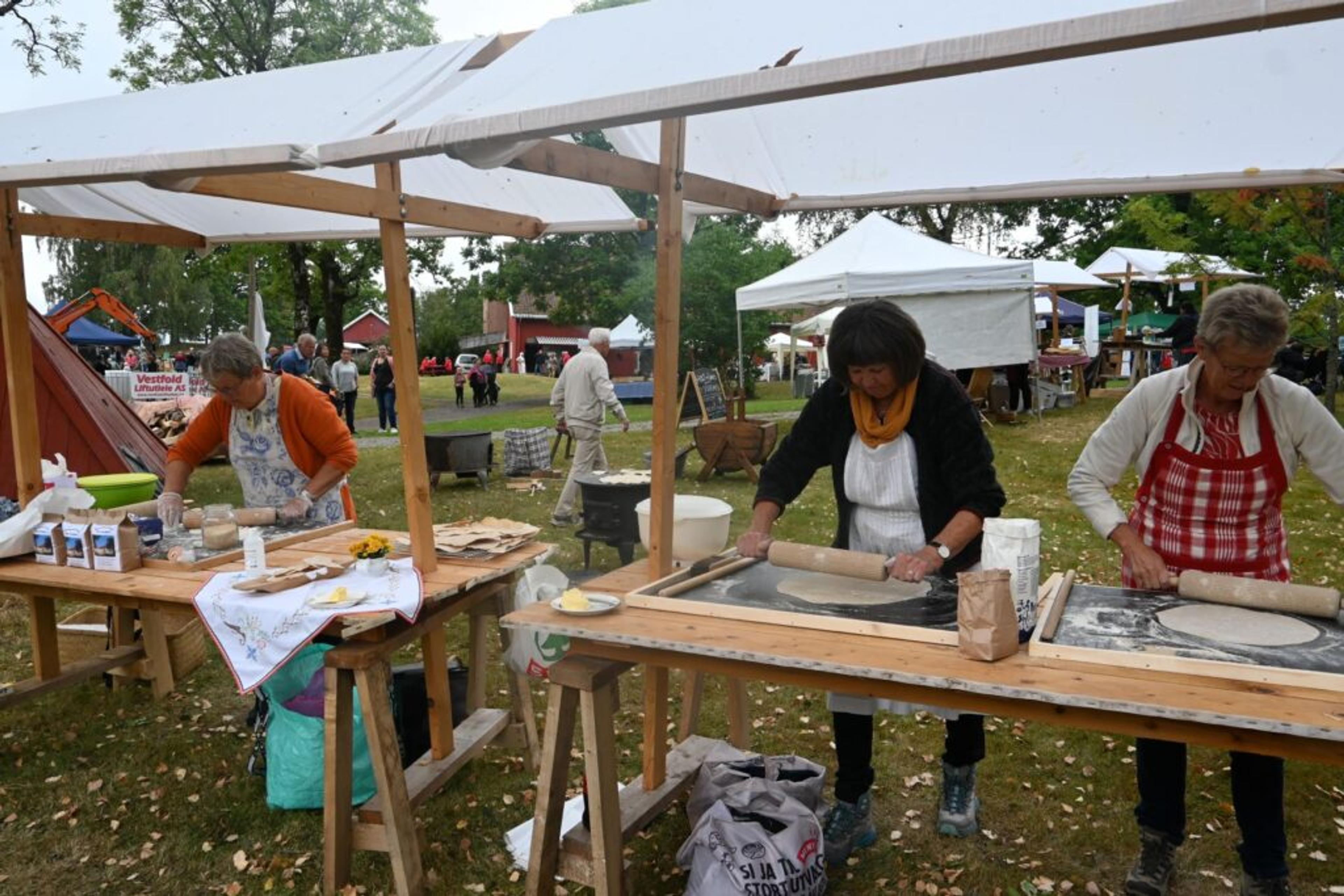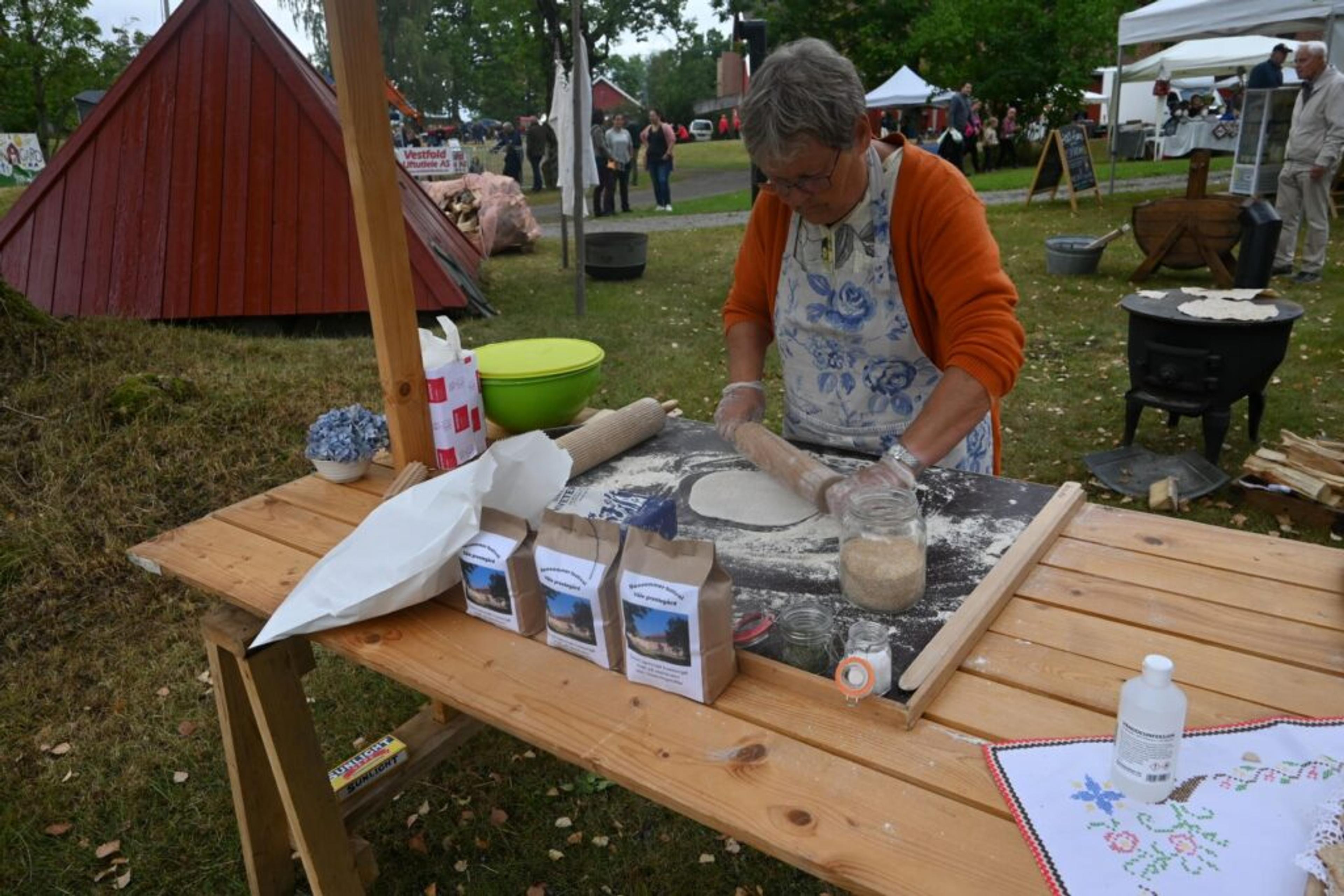 Anne Lise Skaug er en av de som er med å lager flatbrød. Hun og de andre damene er frivillige fra historielaget.