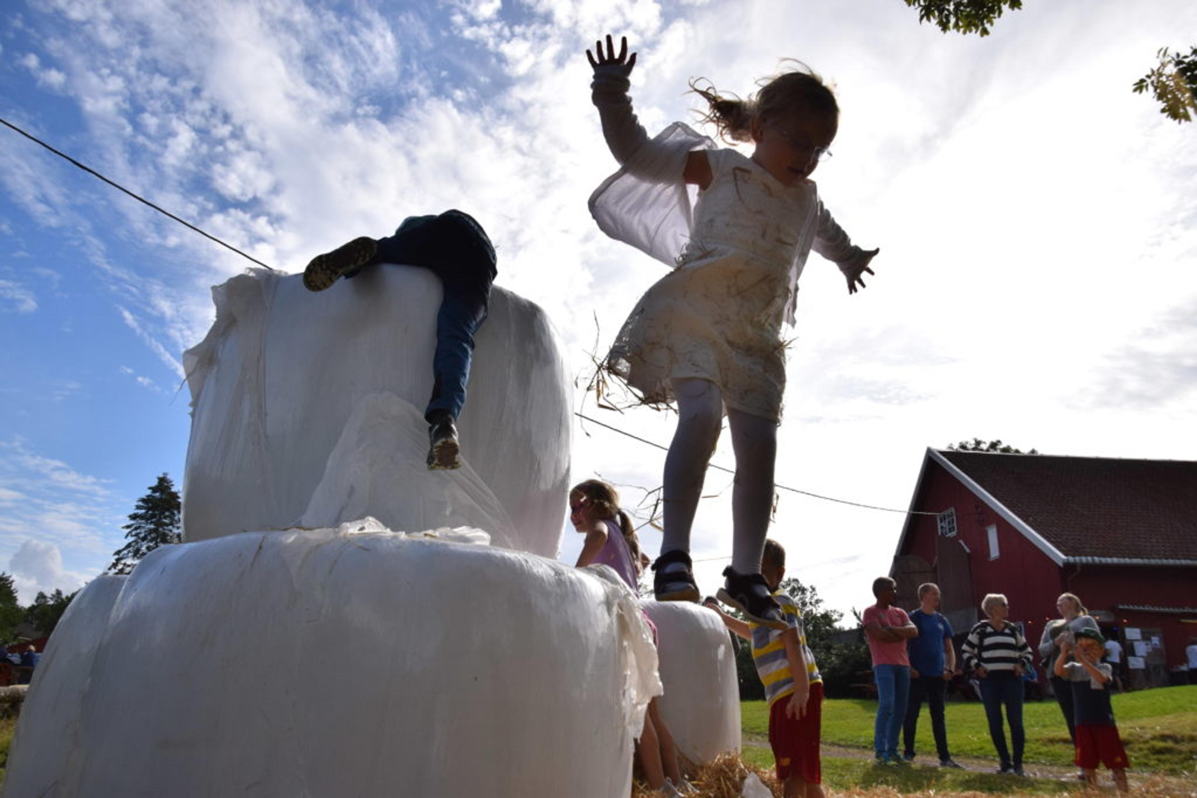 HOPP I HØYET! Klatre opp og hoppe ned – kan det bli mer moro enn det? Bildet er fra den siste Seinsommerfestivalen på Våle prestegård for tre år siden, før to år med korona-avlysninger. Foto: Stian Ormestad.