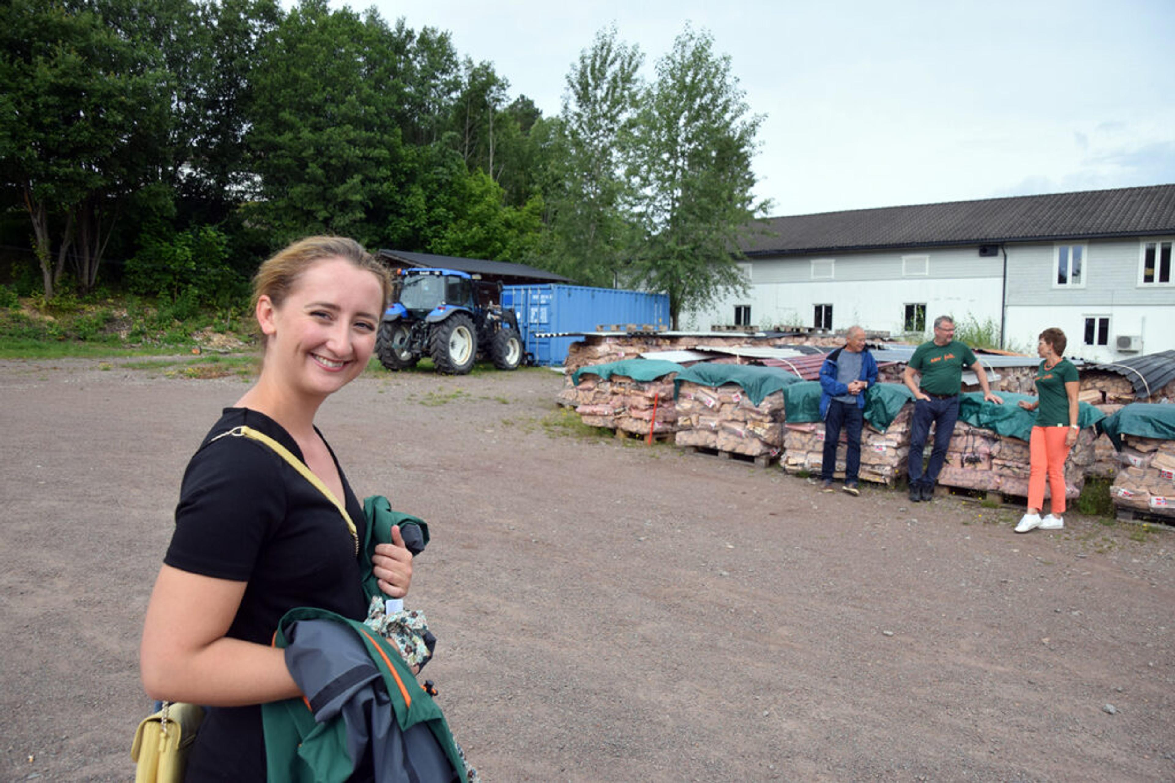 SAMFUNNSENGASJERT: Karoline Lie (25) holder her orden på Senterparti-følget med gammel-ordfører Thorvald Hillestad i gamle Re kommune, 2. kandidat Per Asbjørn Andvik fra Ramnes og 1. kandidat Kathrine Kleveland fra Hillestad under siste stortingsvalgkamp i Vestfold. Her på besøk hos Olgars på Brår på seinsommeren for akkurat ett år siden. Foto: Stian Ormestad.