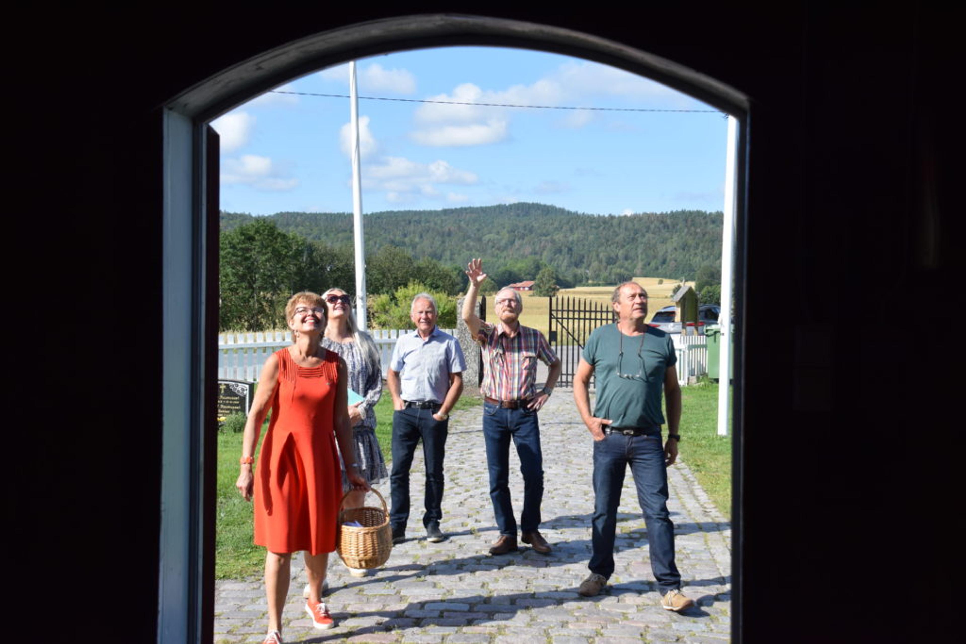 PÅ KIRKEBESØK: Senterparti-følget på vei inn i Ramnes kirke, guida av kirkeverge Per Astrup Andreassen. Fra venstre Kathrine Kleveland, Åslaug Sem-Jacobsen, Thorvald Hillestad, kirkevergen og SPs ordførerkandidat i nye Tønsberg Steinar Solum. Foto: Stian Ormestad.