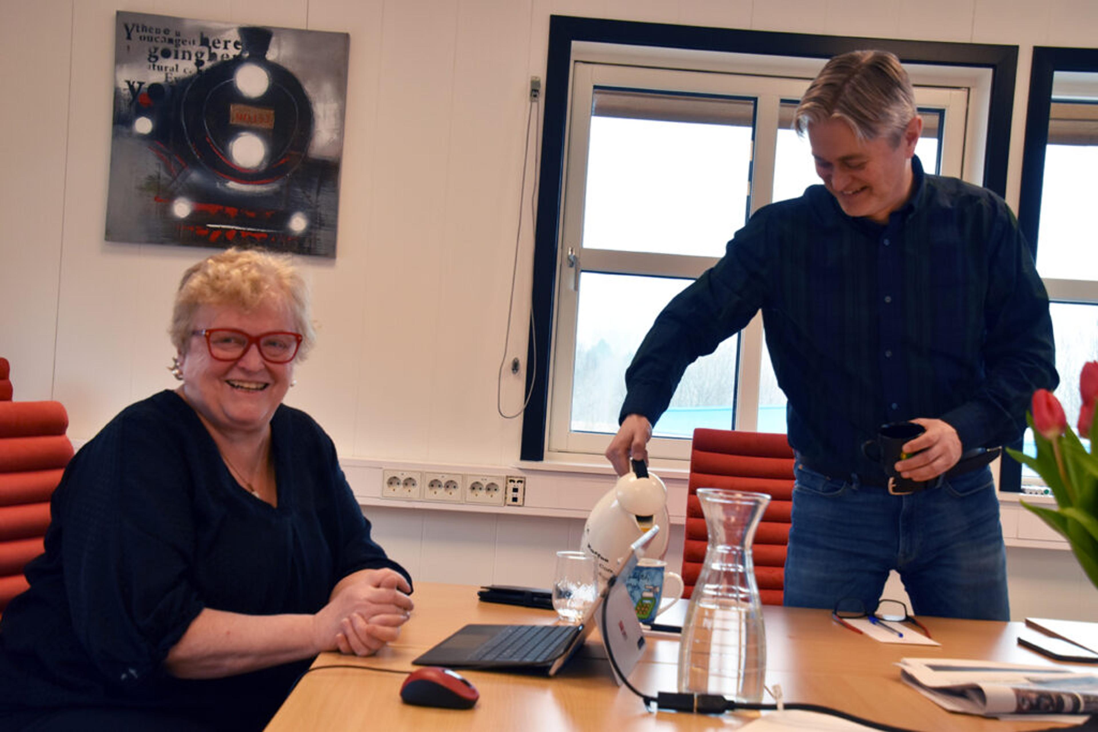 GOD STEMNING: To trivelige reinger, klare for å hjelpe bønder gjennom vanskelige valg. Du kommer langt med de rette spørsmålene over en kaffikopp eller tre, forteller Marit og Dag-Erik – over en kaffikopp med lokalavisa. Foto: Stian Ormestad.