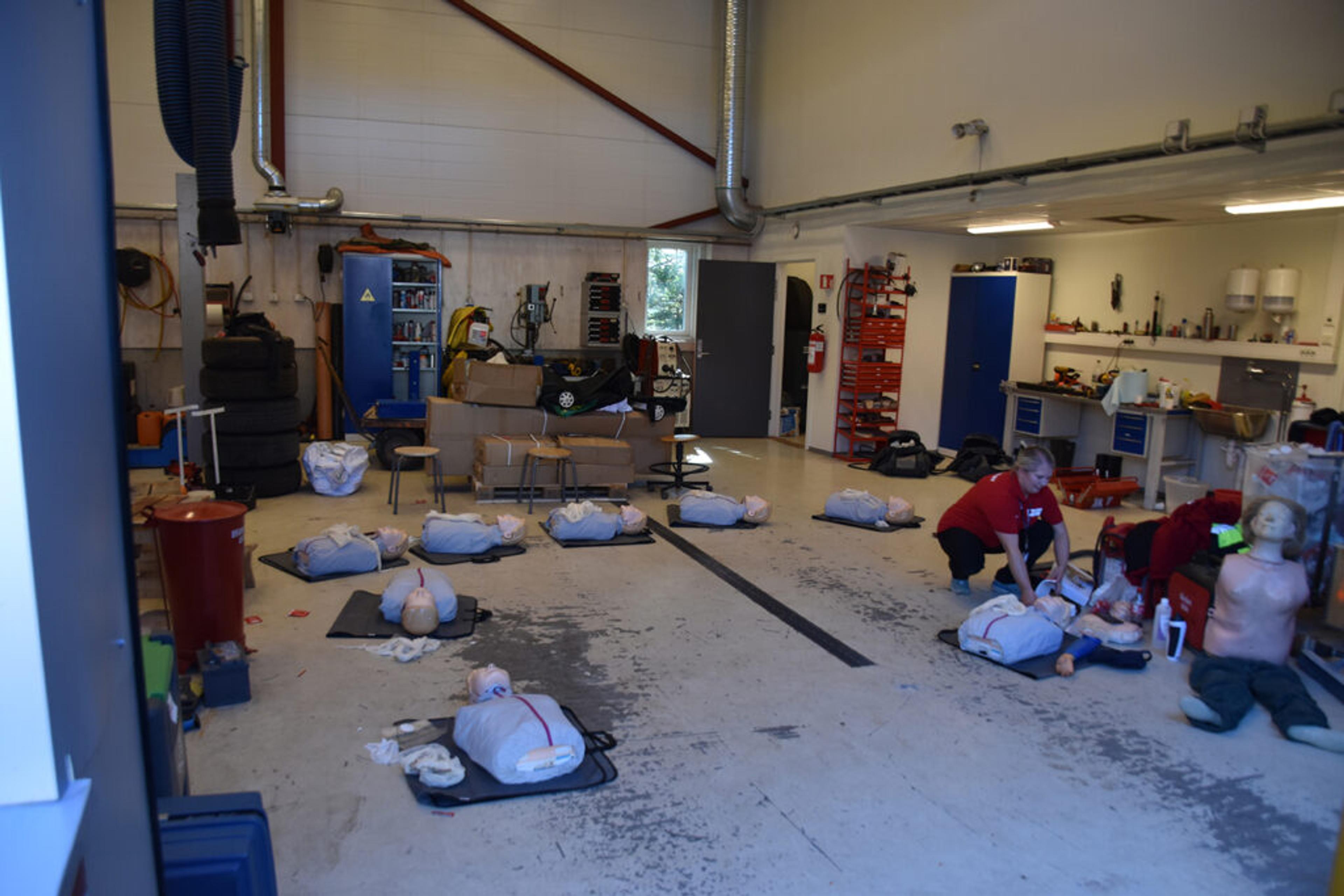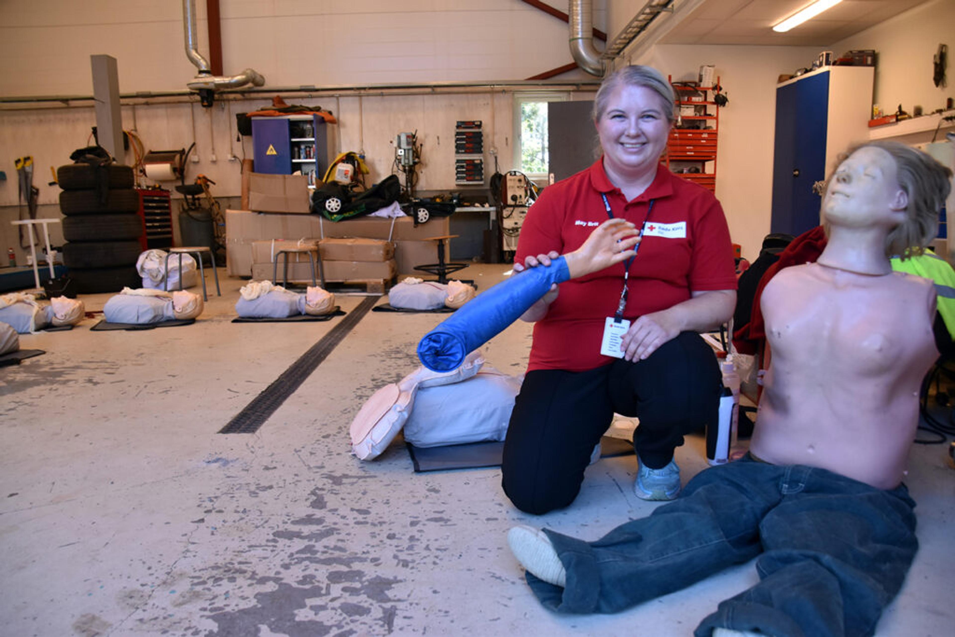 FØRSTEHJELP: Dukkene og May Brit Brudvik fra Re Røde Kors er klar for ei ny gruppe med elever som skal lære førstehjelp i praksis. Foto: Stian Ormestad.