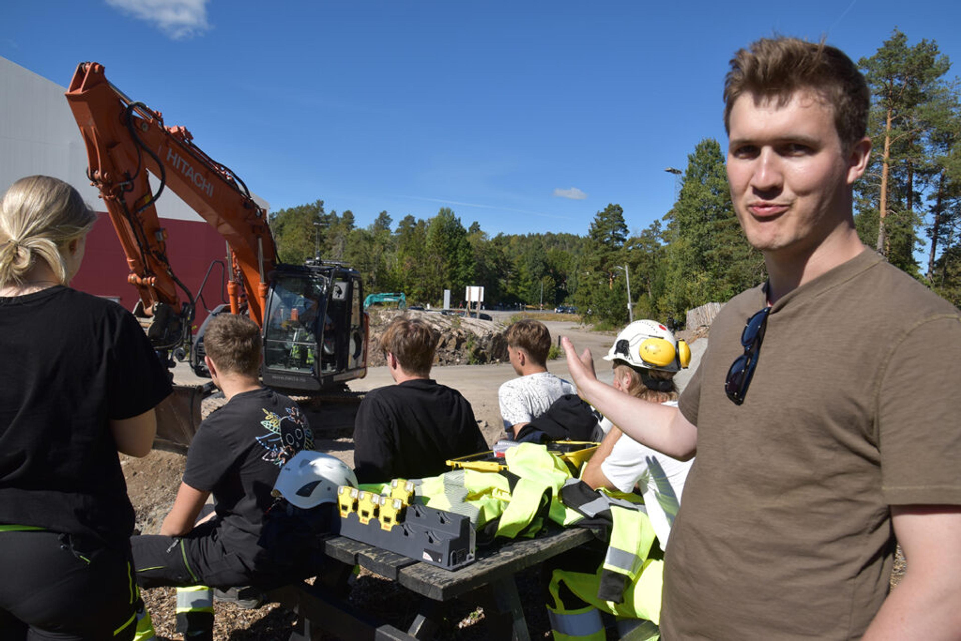 VIL REDDE LIV: Tor Sundset, salgsingeniør i Leika geosystems, lar elevene prøve ut et helt nytt system som varsler maskinføreren om farlige situasjoner ved hjelp av mannskapsbrikker. Foto: Stian Ormestad.