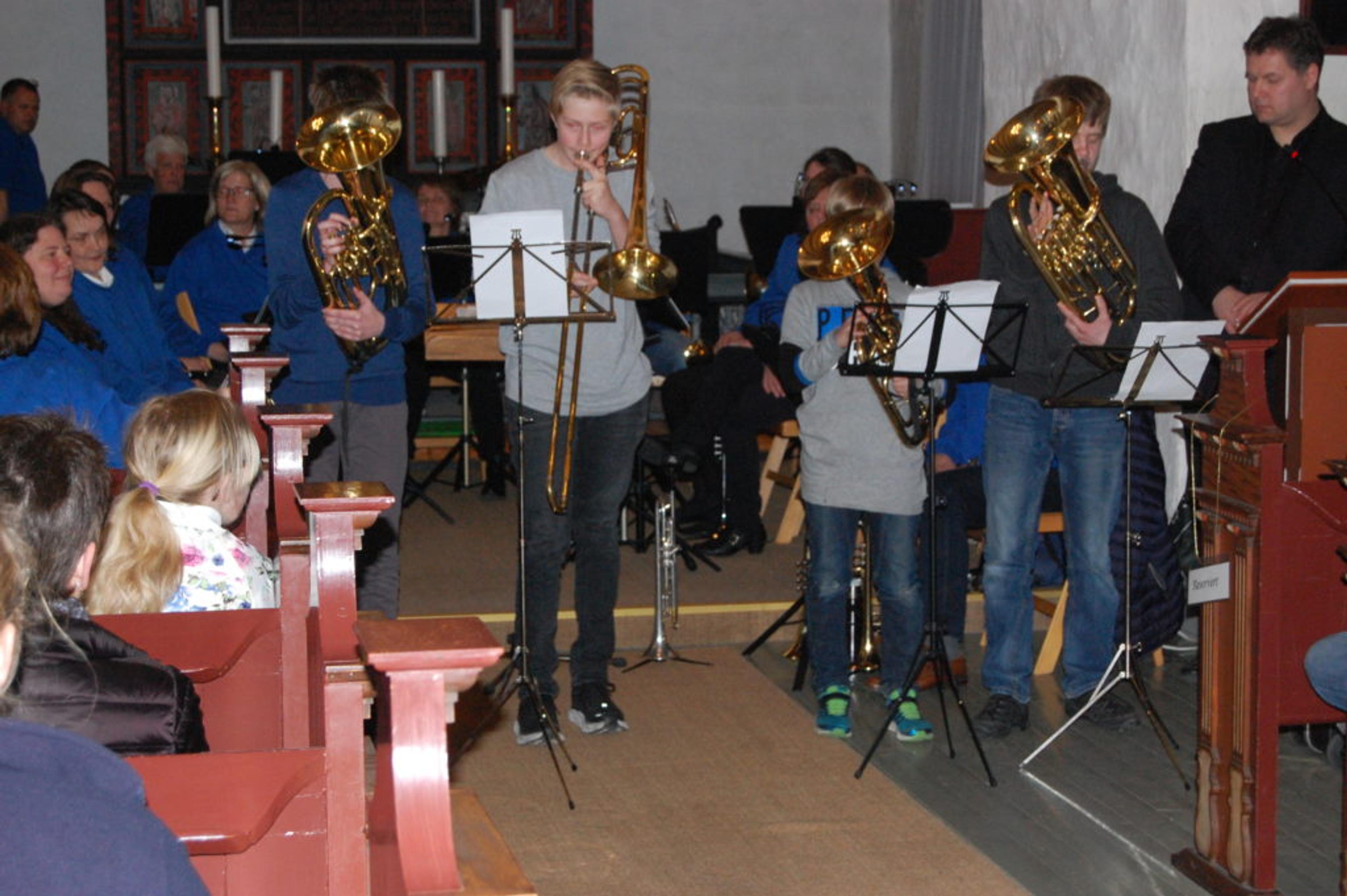 BLÅSEKVARTET: Fire unge musikanter fra Ramnes og Rørostoppen skolekorps i aksjon i Ramnes kirke. Foto: Håkon Westby.
