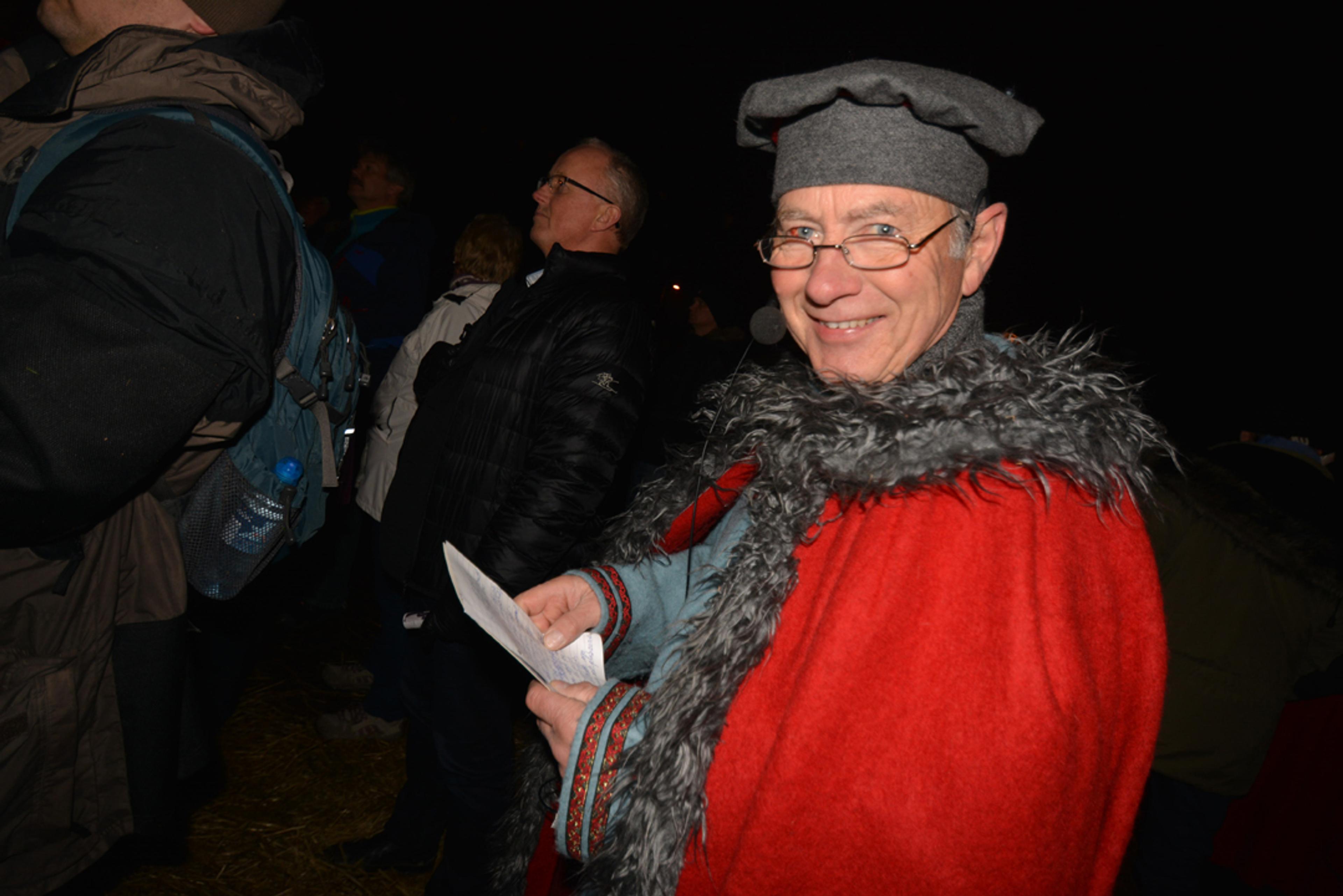 ÆRESBORGER-TITTEL: Ordfører Thorvald Hillestad – for anledningen tittulert høvding – slår den sjette i rekken til Ridder av Re under åpningsseremonien for Re middelalderdager 2018. Foto: Stian Ormestad.