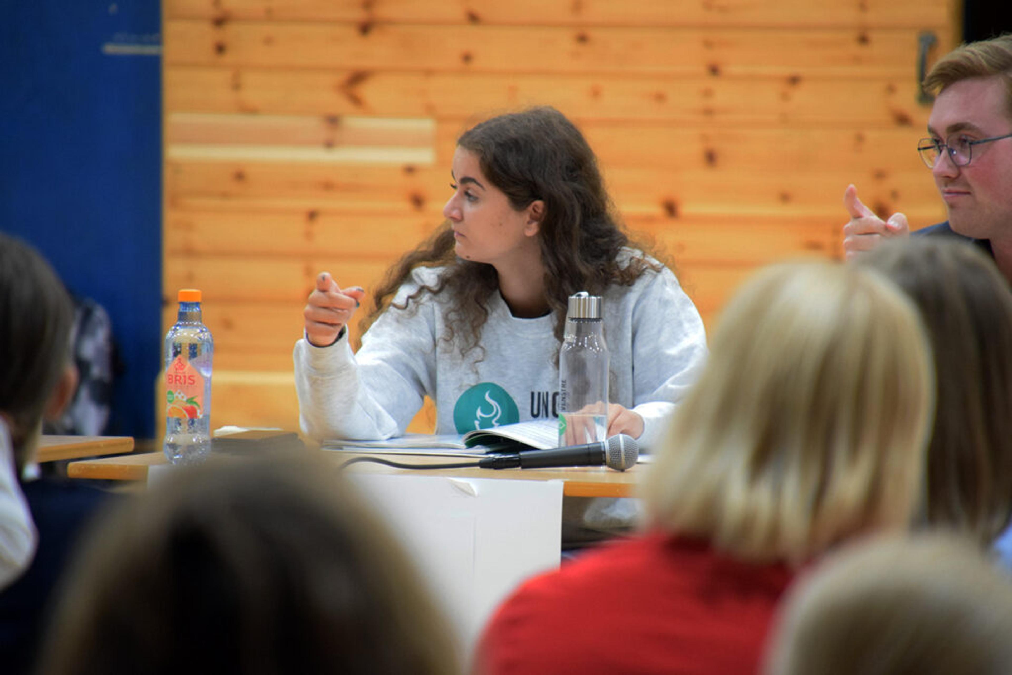 KAN BLI TIDENES YNGSTE STORTINGSREPRENTANT: Camilla Maria Brekke, Arbeiderpartiets 3. kandidat i Vestfold, kan bli tidenes yngste stortingsrepresentant hvis AP får inn tre fra Vestfold. I skrivende stund ligger det ikke an til det, ifølge supermålinga. Her er Camilla Maria i en skoledebatt på Ramnes skole i går. Foto: Stian Ormestad.
