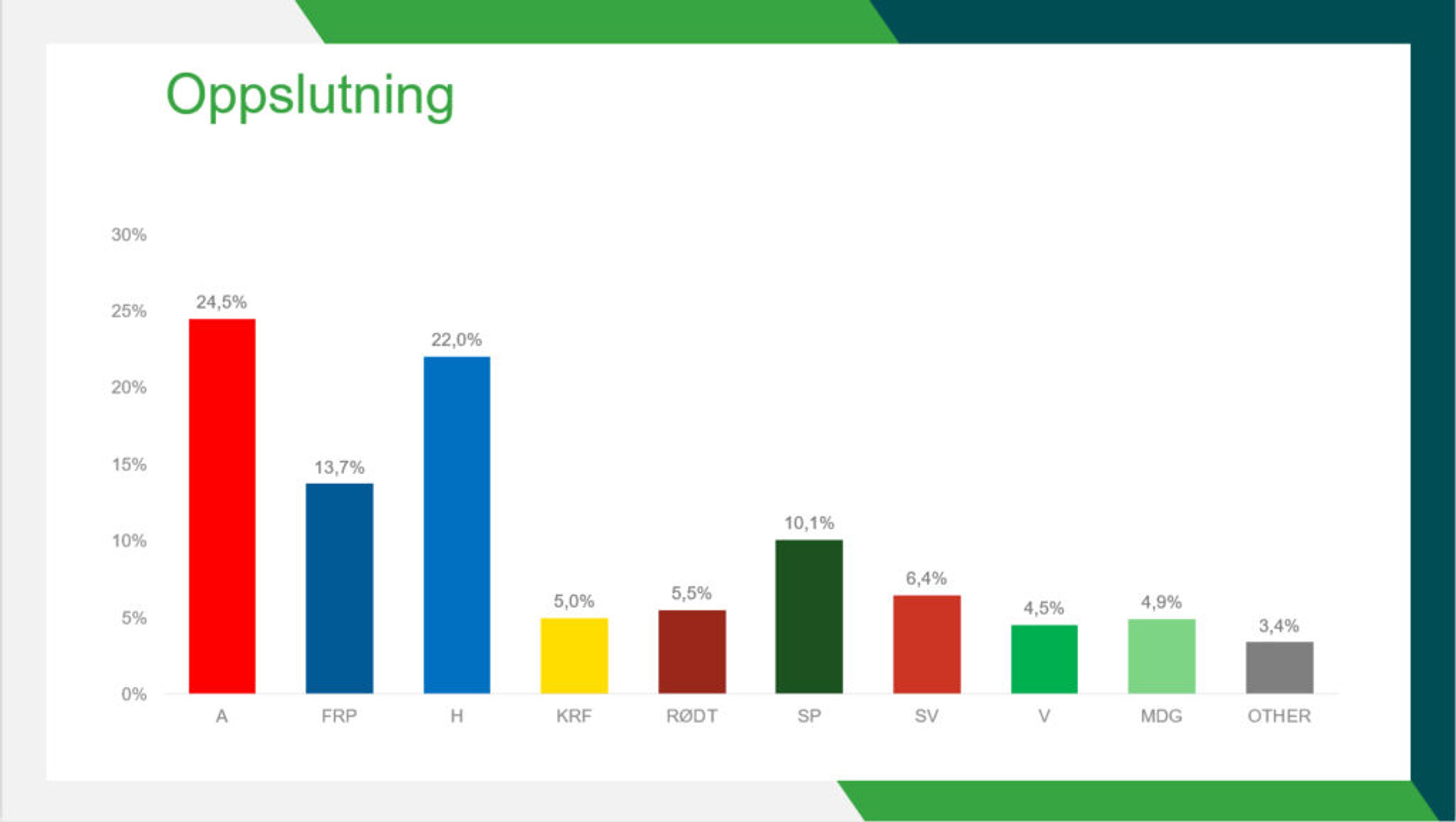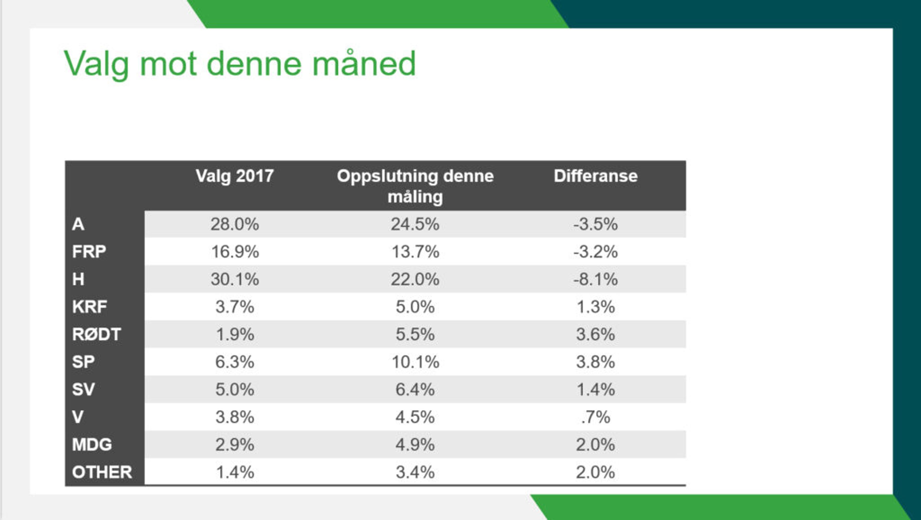 På den andre sida, gjør MDG det samme: Fra 3,5 prosent oppslutning i forrige måling til 4,9 prosent i denne målinga. Og nevnte Rødt er javnt og trutt godt over sperregrensa.