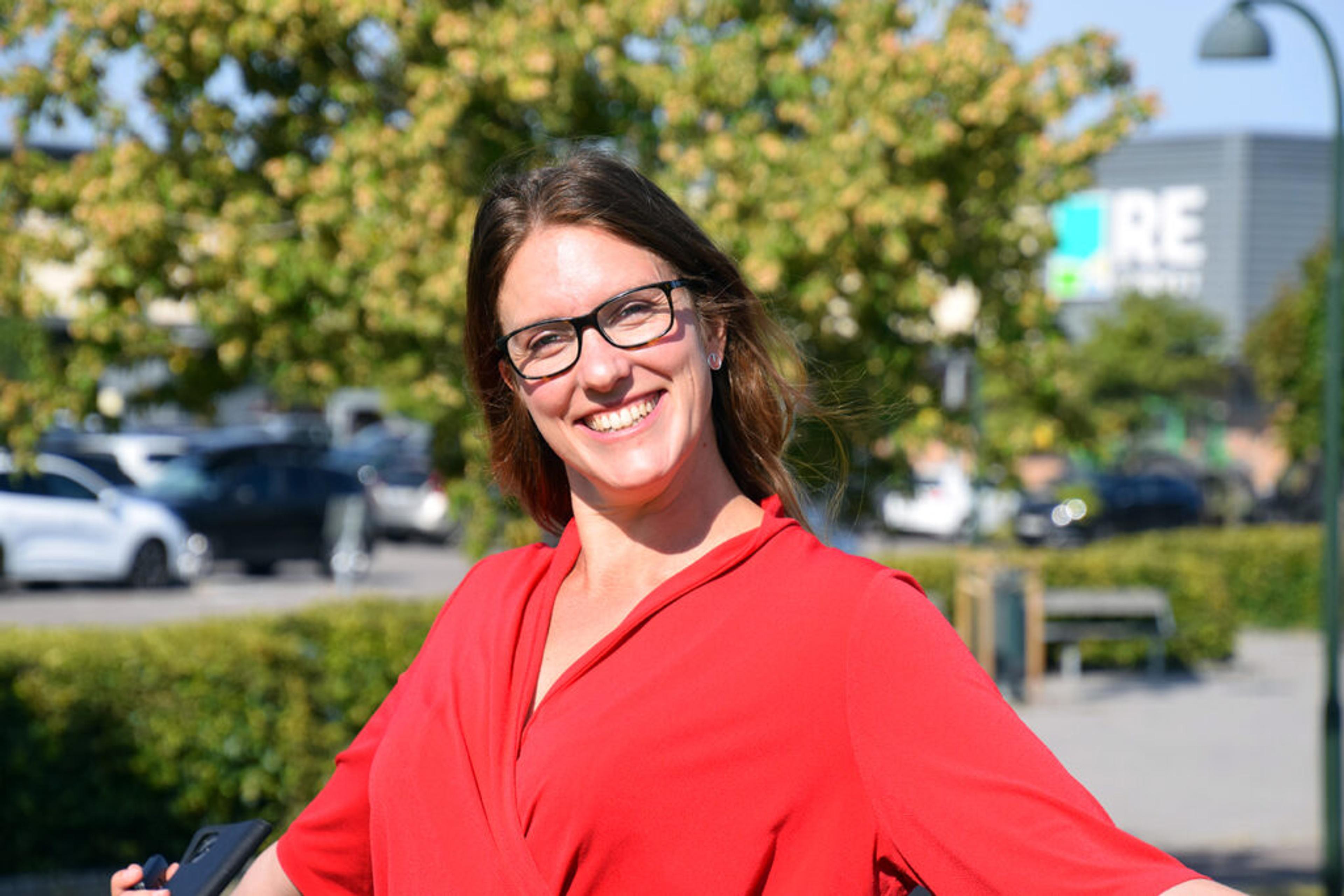 VESTFOLD-VELGERNE SER RØDT: Maren Njøs Kurdøl (R) kan juble over at forrige gode supermeningsmåling bare blir enda mer super for Rødt sin del. Her på en rød benk i Revetalparken, tidligere i valgkampen. Foto: Stian Ormestad.