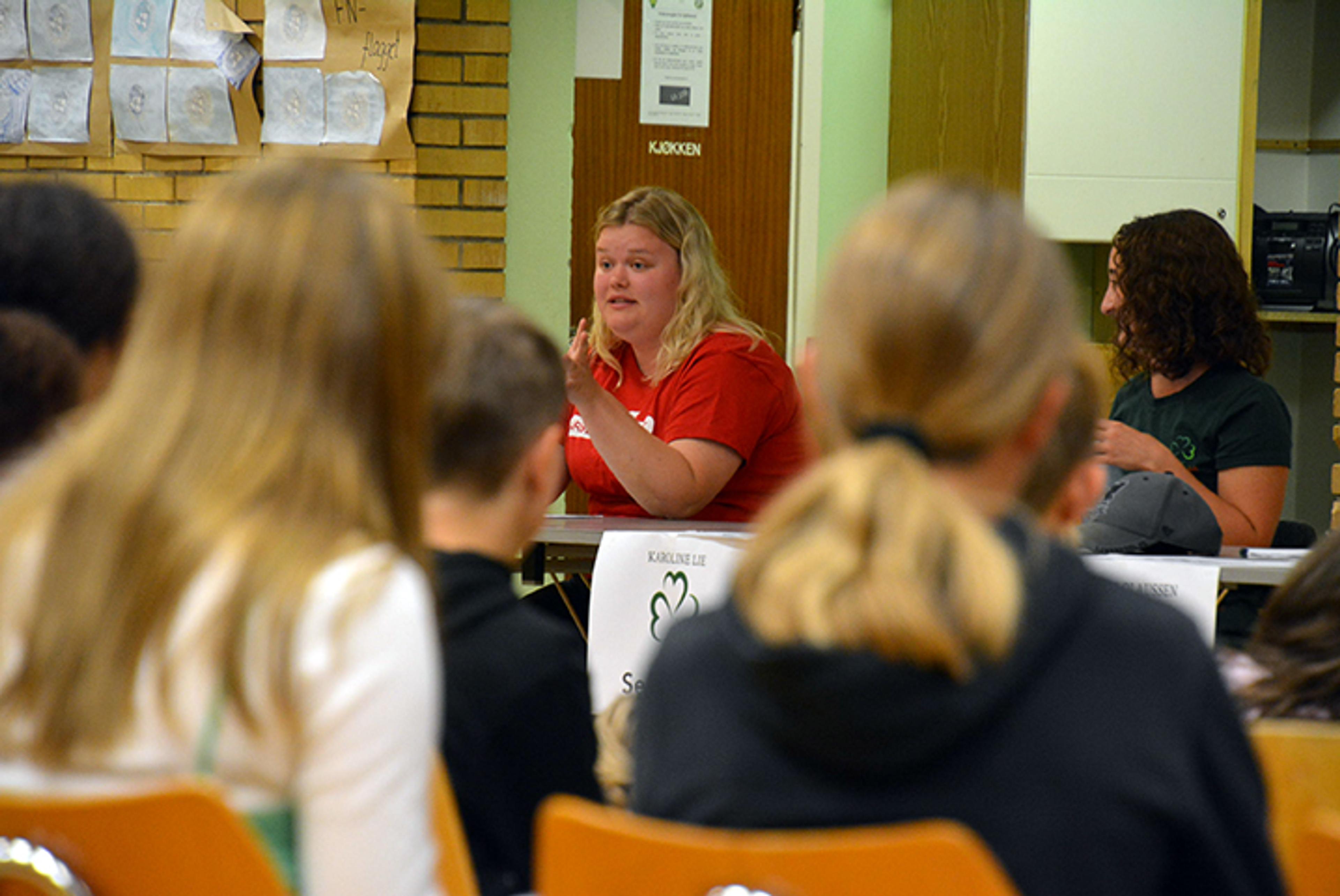 DEN STORE OVERRASKELSEN I SKOLEVALGET: Unge Venstre-representanten Elise Daniella Rodrigues Skalmeraas snakka Venstre inn til tidenes beste skolevalgresultat på Re VGS. Også i siste supermeningsmåling før valget gjør Venstre det bedre enn på lenge. Foto: Stian Ormestad.