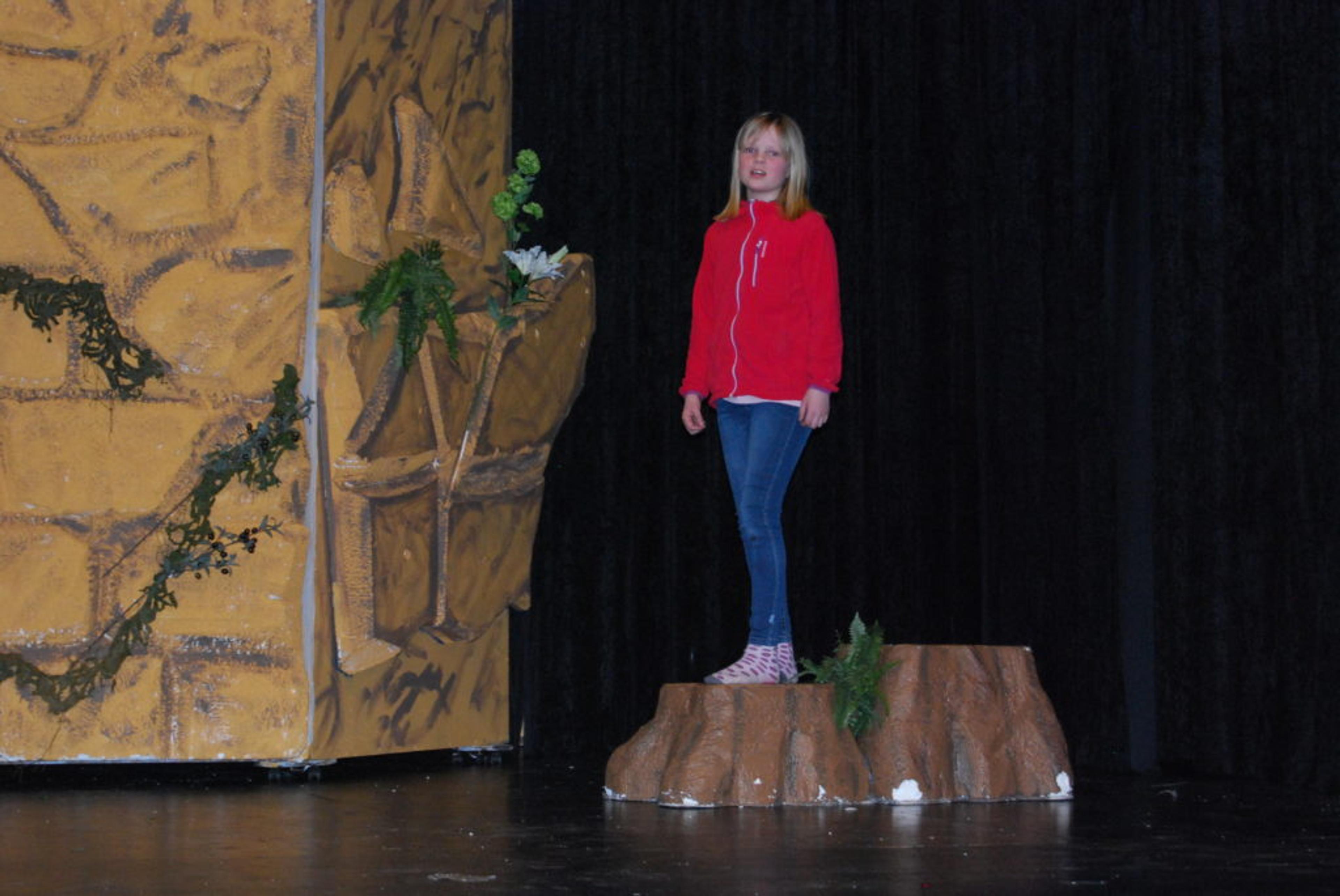 MOWGLI: Elea Kirkeberg (10) spiller Mowgli. Hun gleder seg til endelig at alle forberedelser er ferdig og sceneteppet går opp for premieren lørdag 1. april. Foto: Amalie Andersen.