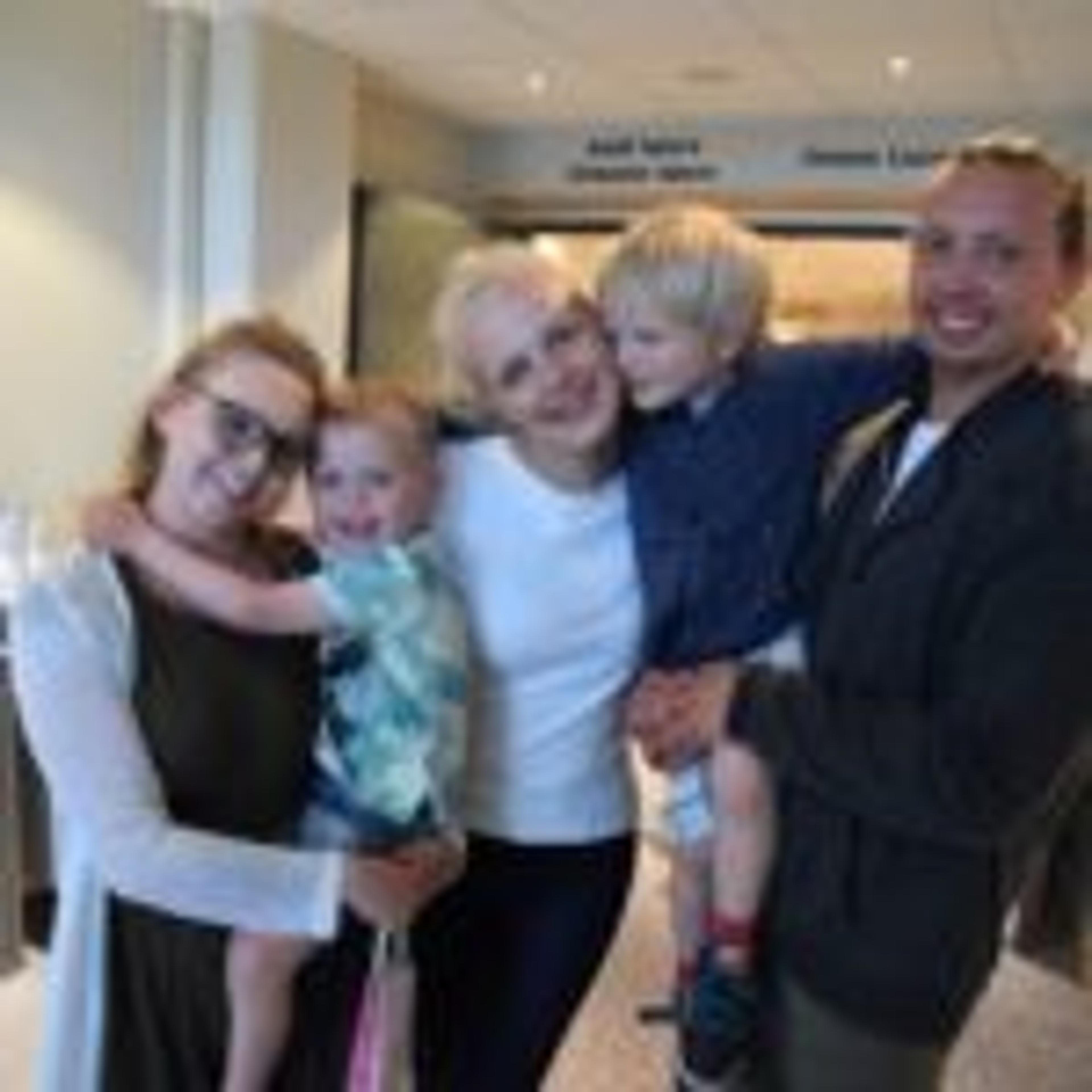 EVAKUERTE: Fra venstre ser vi Elin Sofia Vestin (25) og Daniel Vestin Bruun (3) som leier hos Ida Marie Solum (24) og samboer Patrick Berg (25), som står på hver side av sønnen Odin Elian Solum (3). Foto: Stian Ormestad.