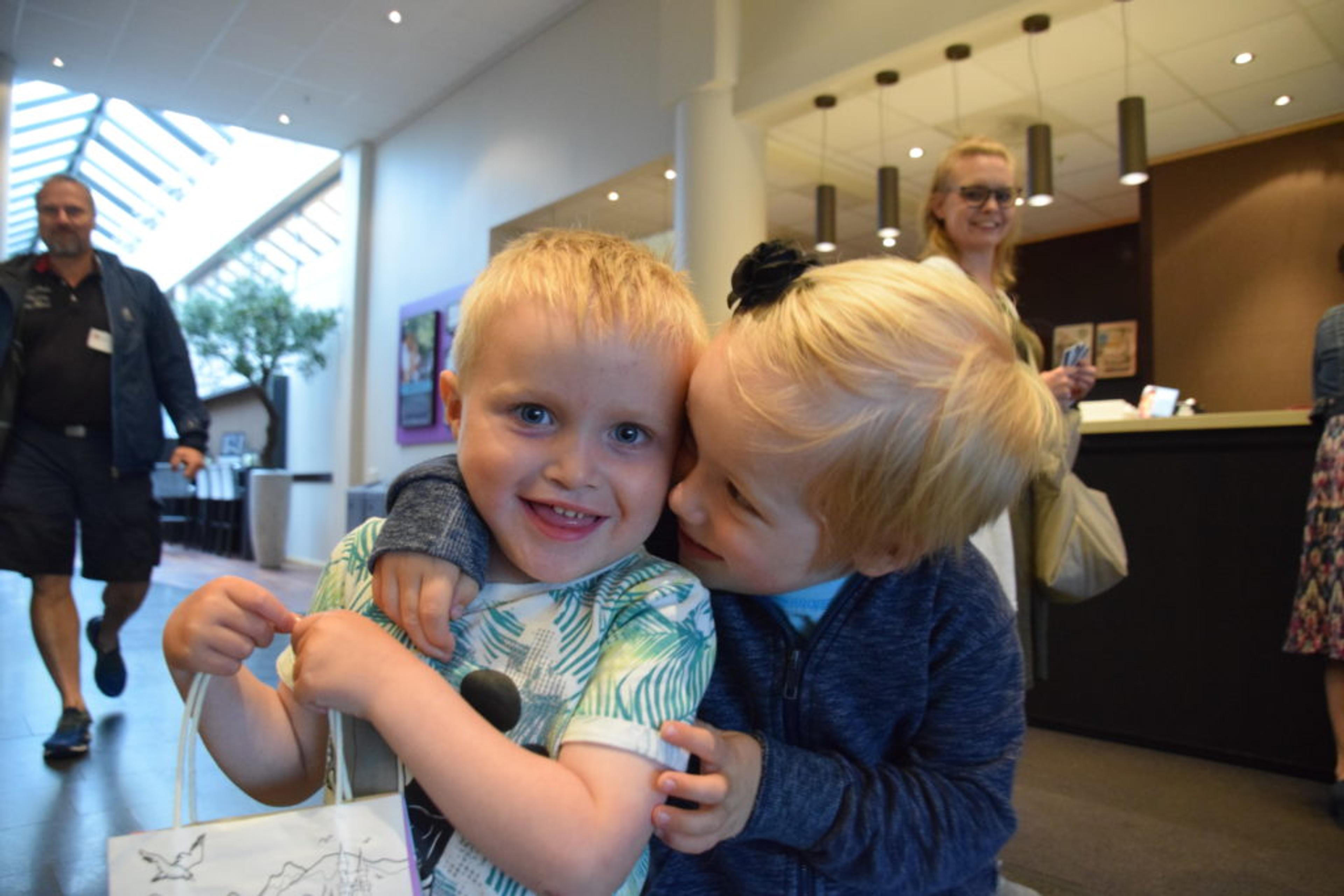 GLADE GUTTER: Daniel Vestin Bruun (3) og Odin Elian Solum (3) nyter livet som evakuert på hotell i Tønsberg. Men Daniel savner alle lekene sine, og Odin badebassenget i hagen. Foto: Stian Ormestad.