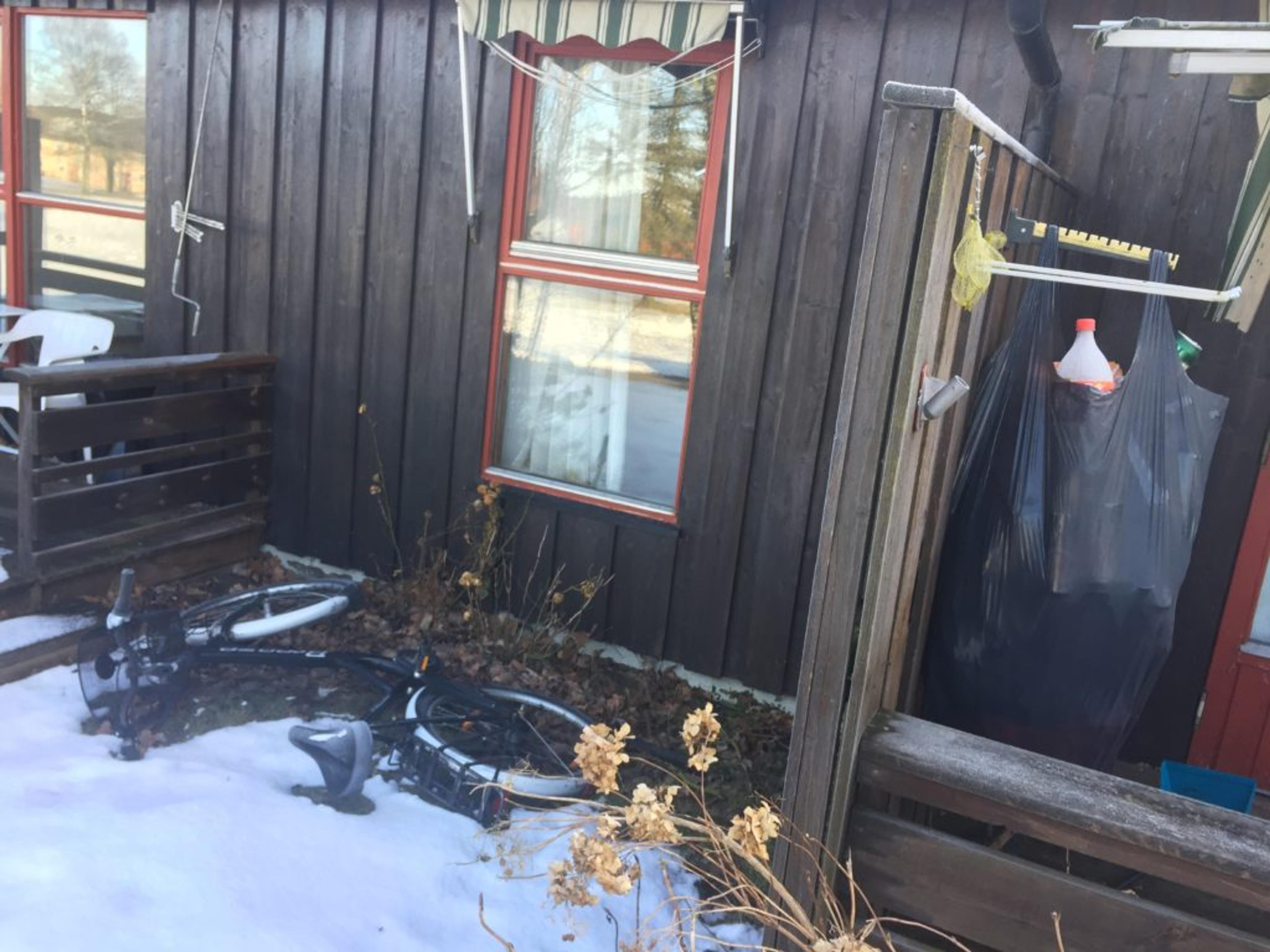 SØPPEL OG SYKKEL: Uteområdene framstår som rotete og forsøpla. Her henger det en stapp full søplesekk på verandaen og i blomstebeddet ligger det slengt en sykkel. Foto: Stian Ormestad.