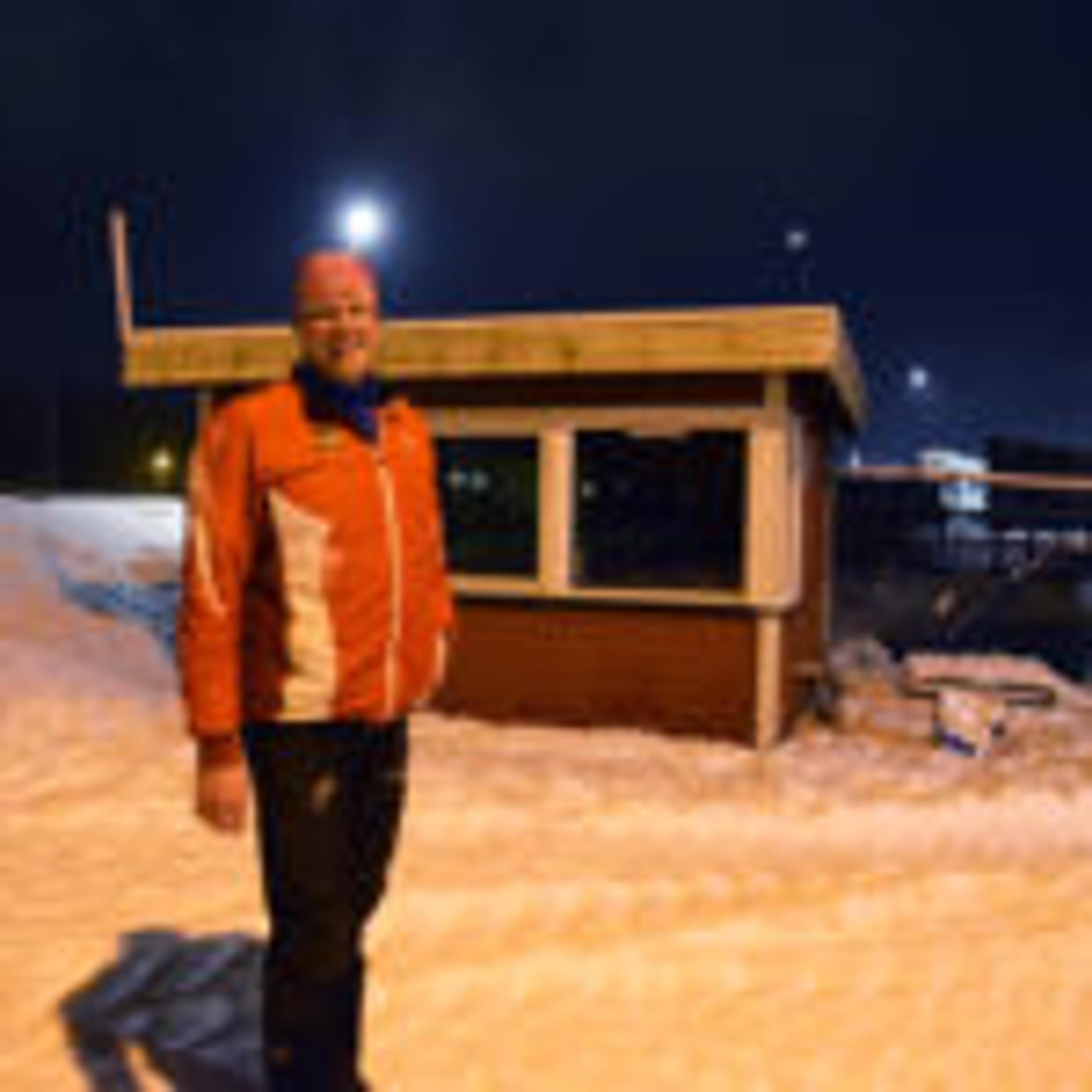 BUA: Denne bua bak Sven Arne har mange ildsjeler sitti mange timer i, for å sørge for flotte skiløyper på Bibo – hele vinteren lang. Her styres snøproduksjonen fra. Foto: Stian Ormestad.