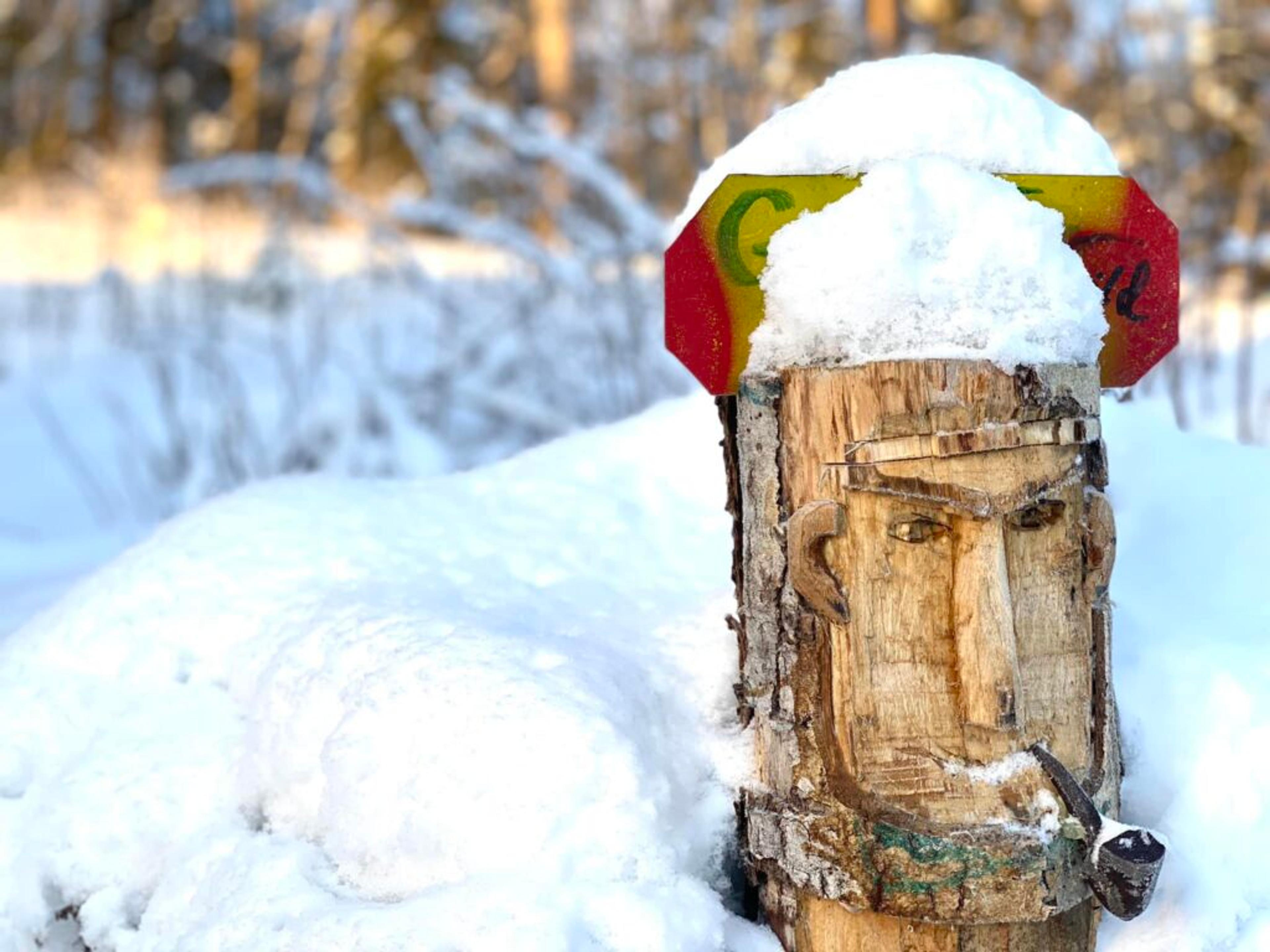GOD TUR: Treskallene etter avdøde Arild Johansen ønsker alle en god tur, med en skikkelig snøhatt på hue. Foto: Stian Ormestad, ReAvisa.