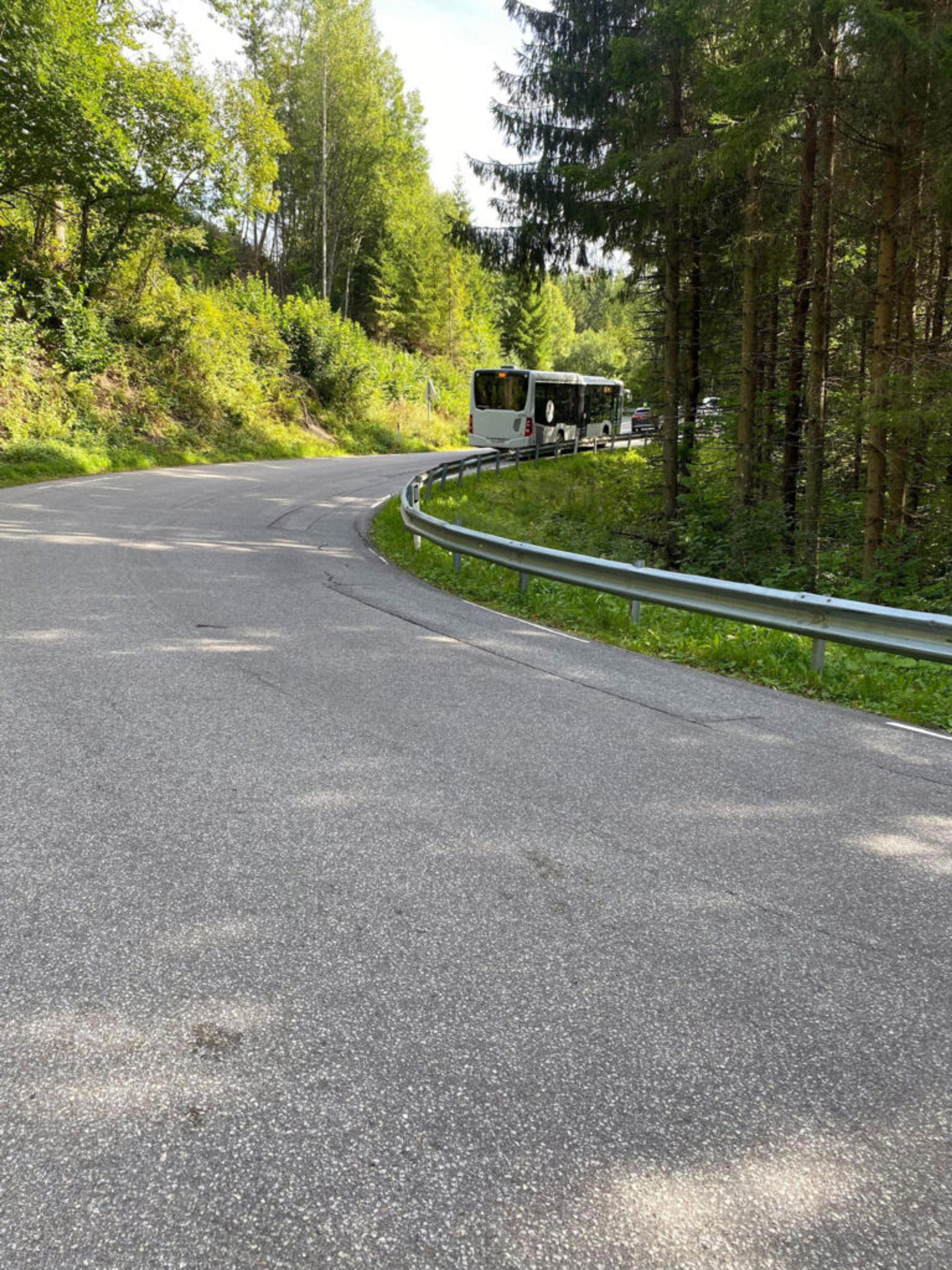 Bussen sto igjen midt i den ene veibanen, i 80-sone, mellom to svinger.