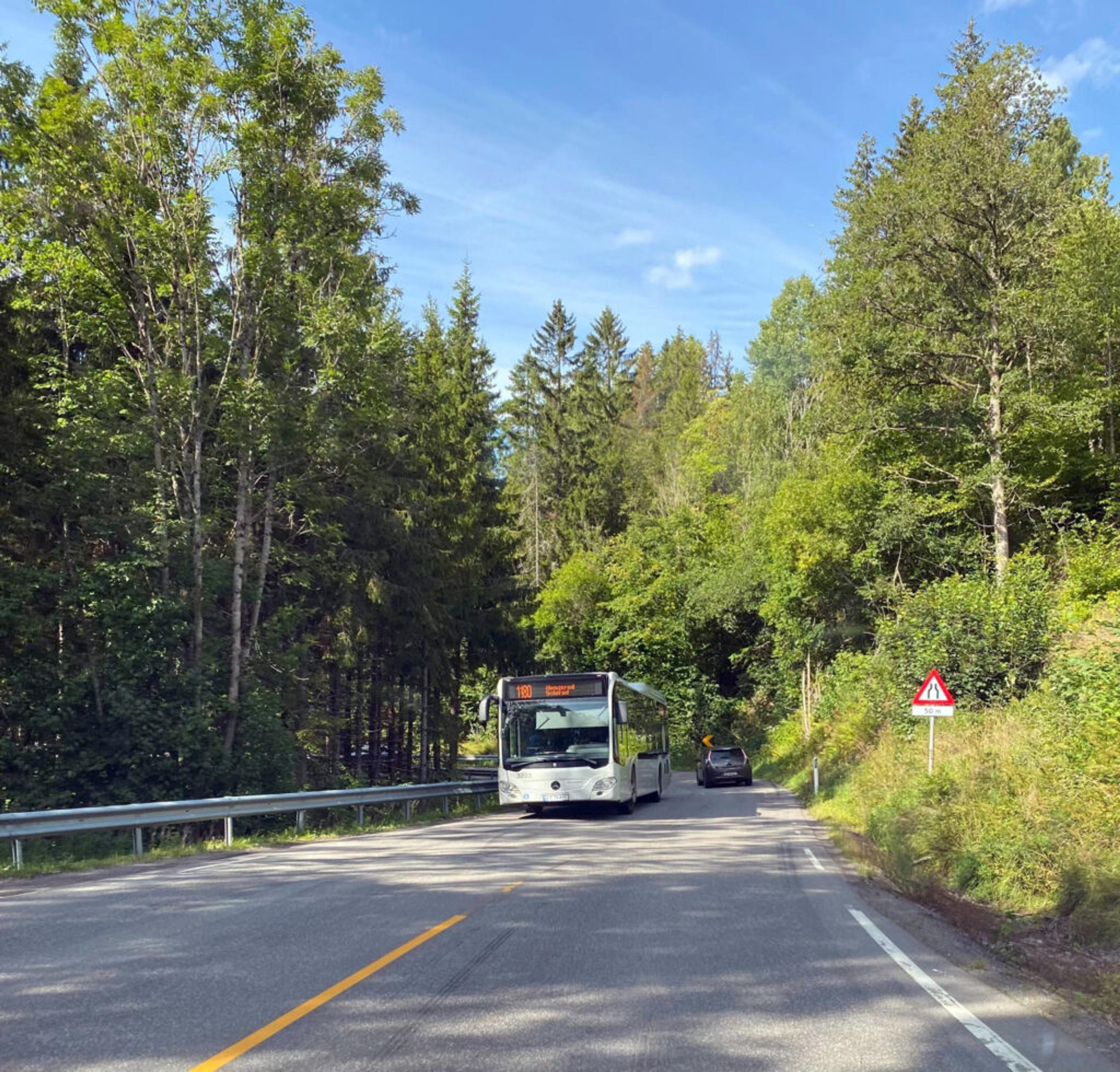 BOM STOPP: Sjåføren skal ha fått opp en motorlampe, mista trekkraft, og der ble bussen stående. Uten nødblink, ingen varseltrekant, men ifølge første melding fra Tide «ikke til hinder for annen trafikk». Foto: Privat.