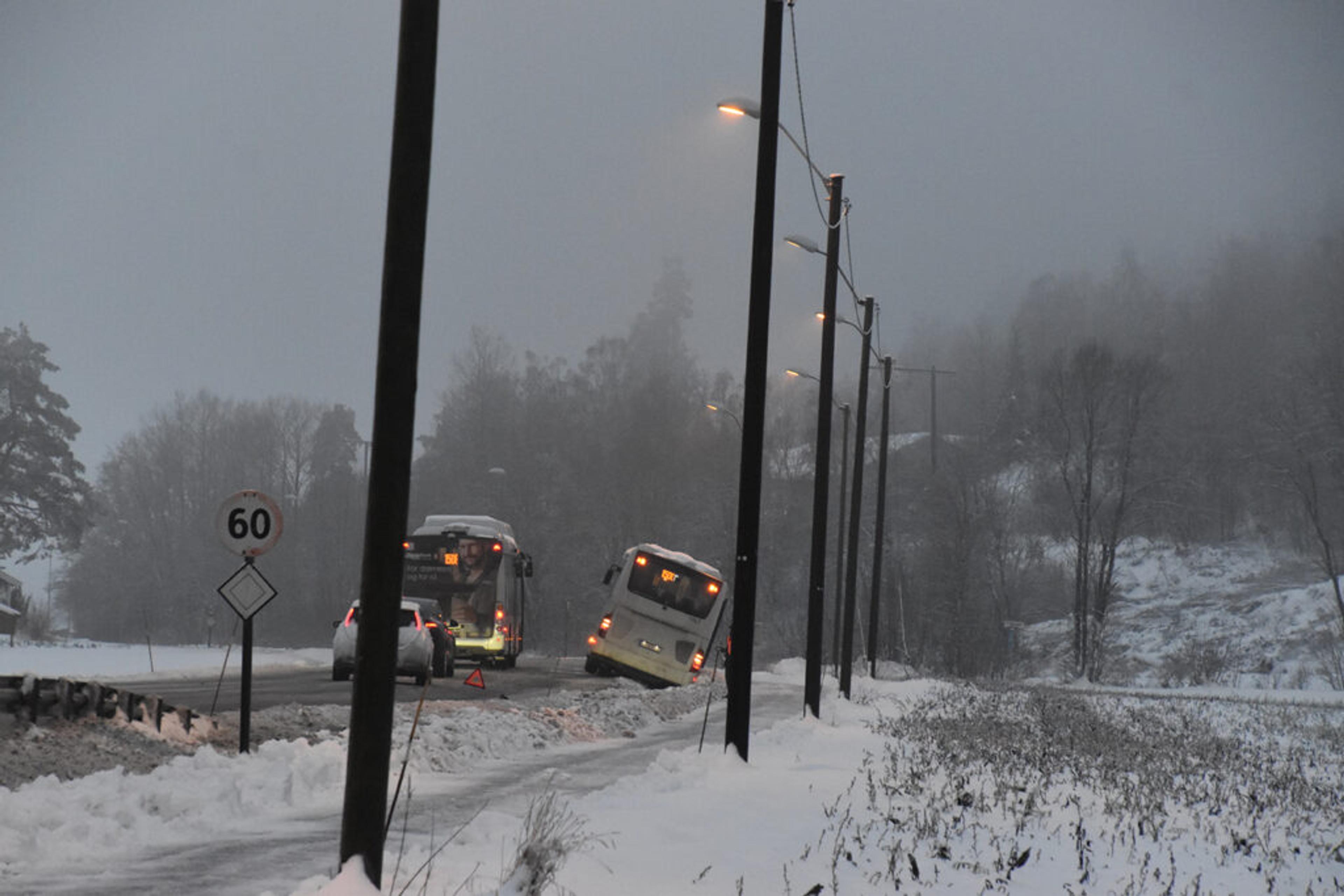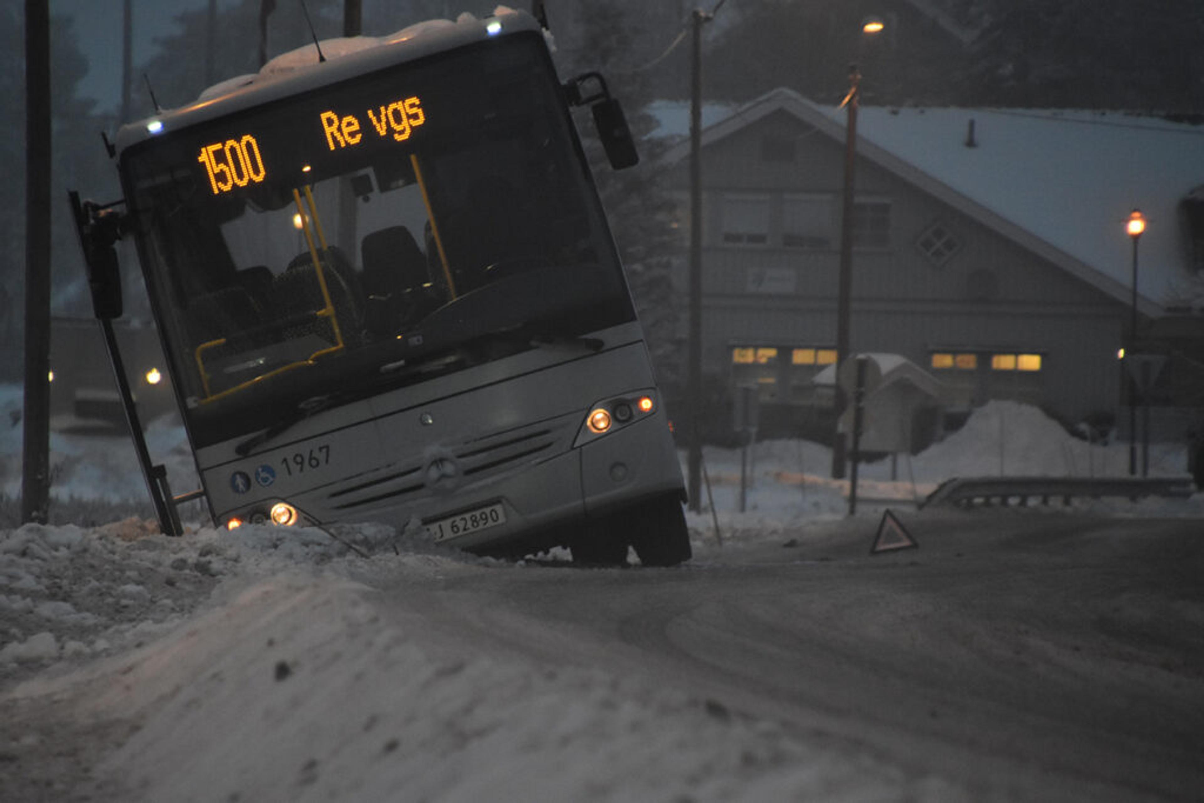 Før skolestart tirsdag morgen 20. desember sklir en skolebuss på vei til Re VGS i grøfta og setter seg bom fast på Brårveien på Brår.