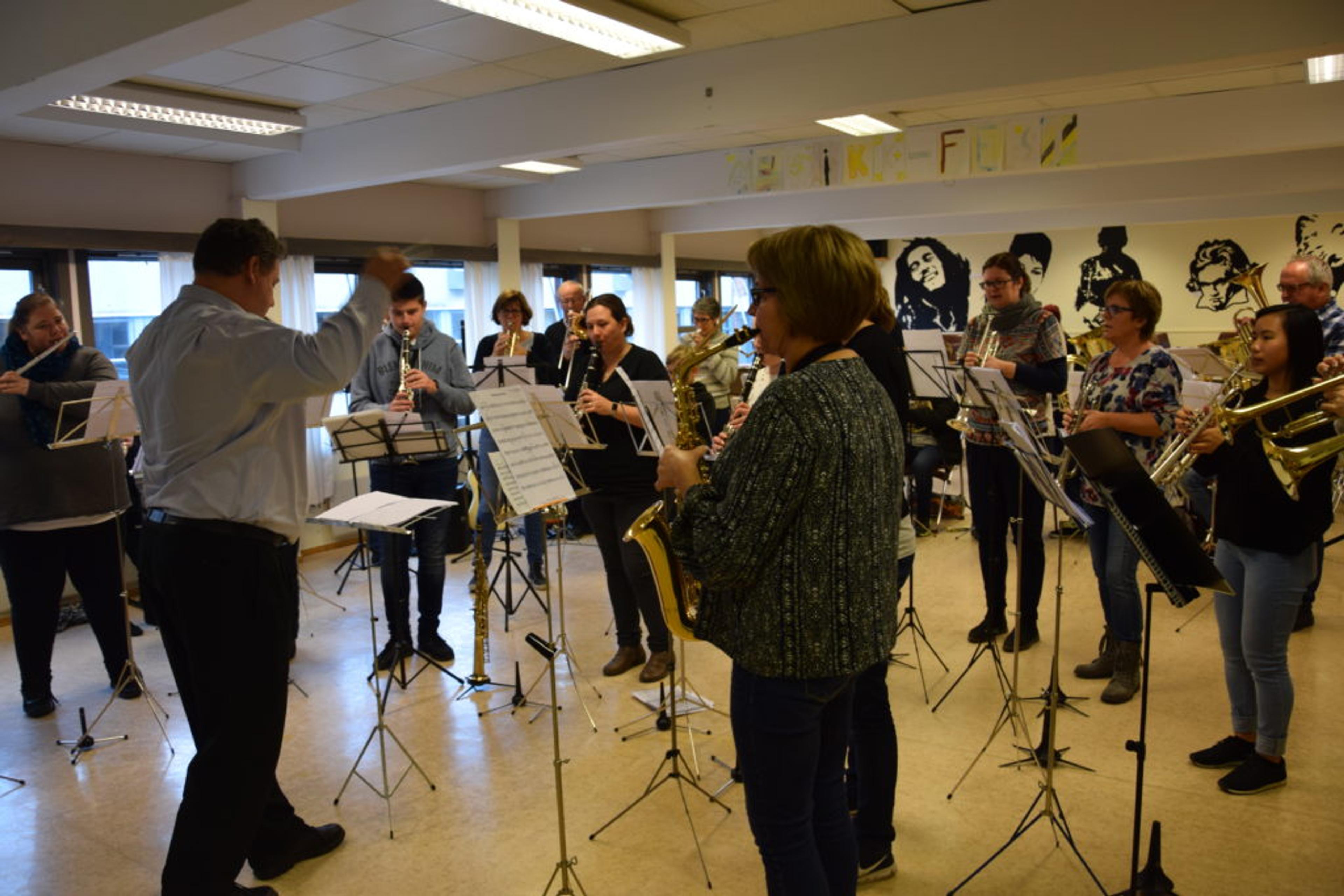 ØVER TIL KONSERT: Ramnes og Røråstoppen skolekorps øver her sammen med Blågjengen, under sistnevntes dirigent Niclas Bredahl. Voksenkorpset gjester konserten under tre fellesnummer. Foto: Håkon Westby.