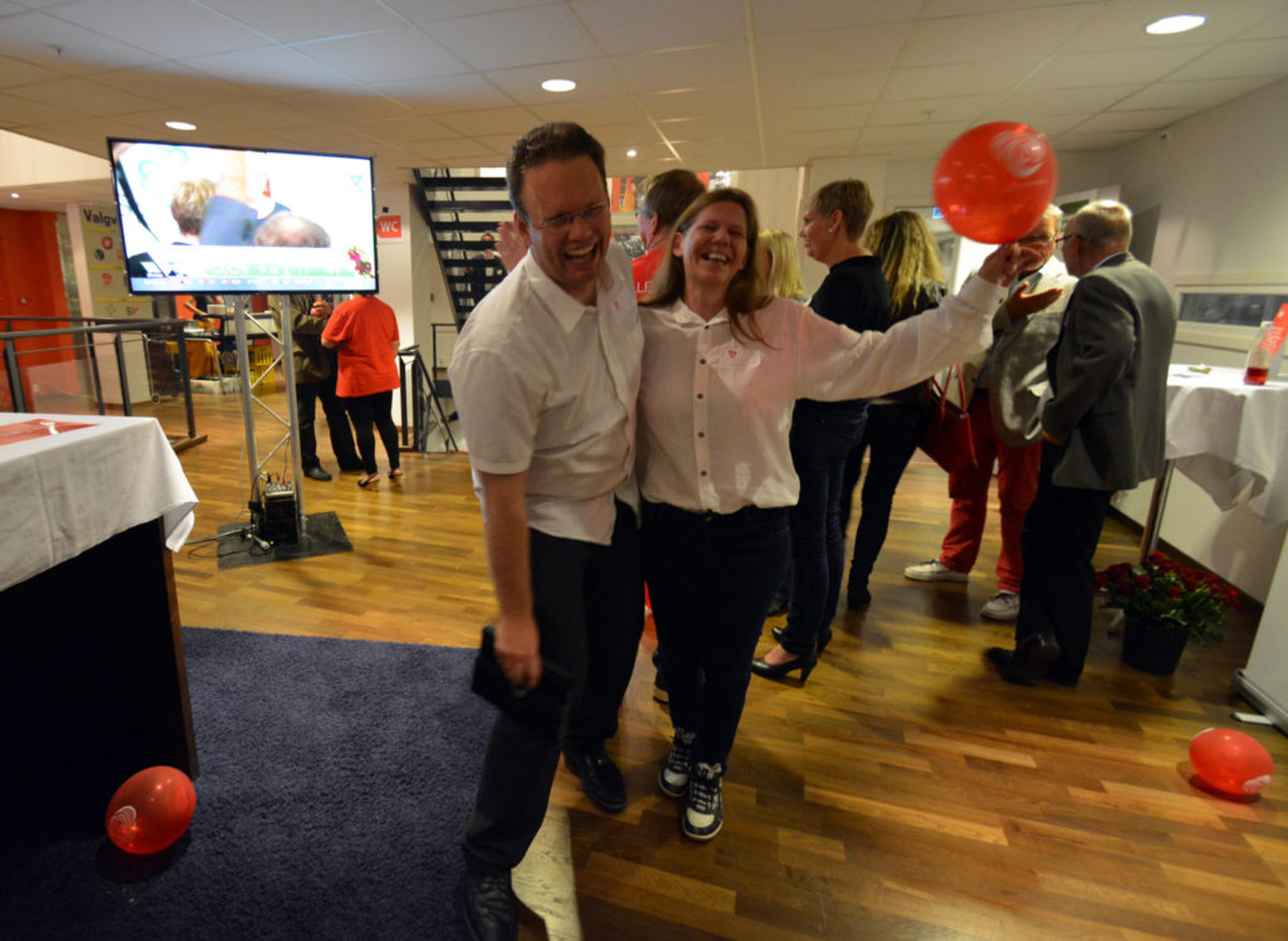 GOD STEMNING: Det er nok minst like god stemning i Re Arbeiderparti i kveld, som det var under valgvaken for to stortingsvalg siden. Her jubler Lars Jørgen Ormestad og Thordis Skallist Hovet over fortsatt rød-grønn regjering den gang. Arkivfoto: Stian Ormestad.