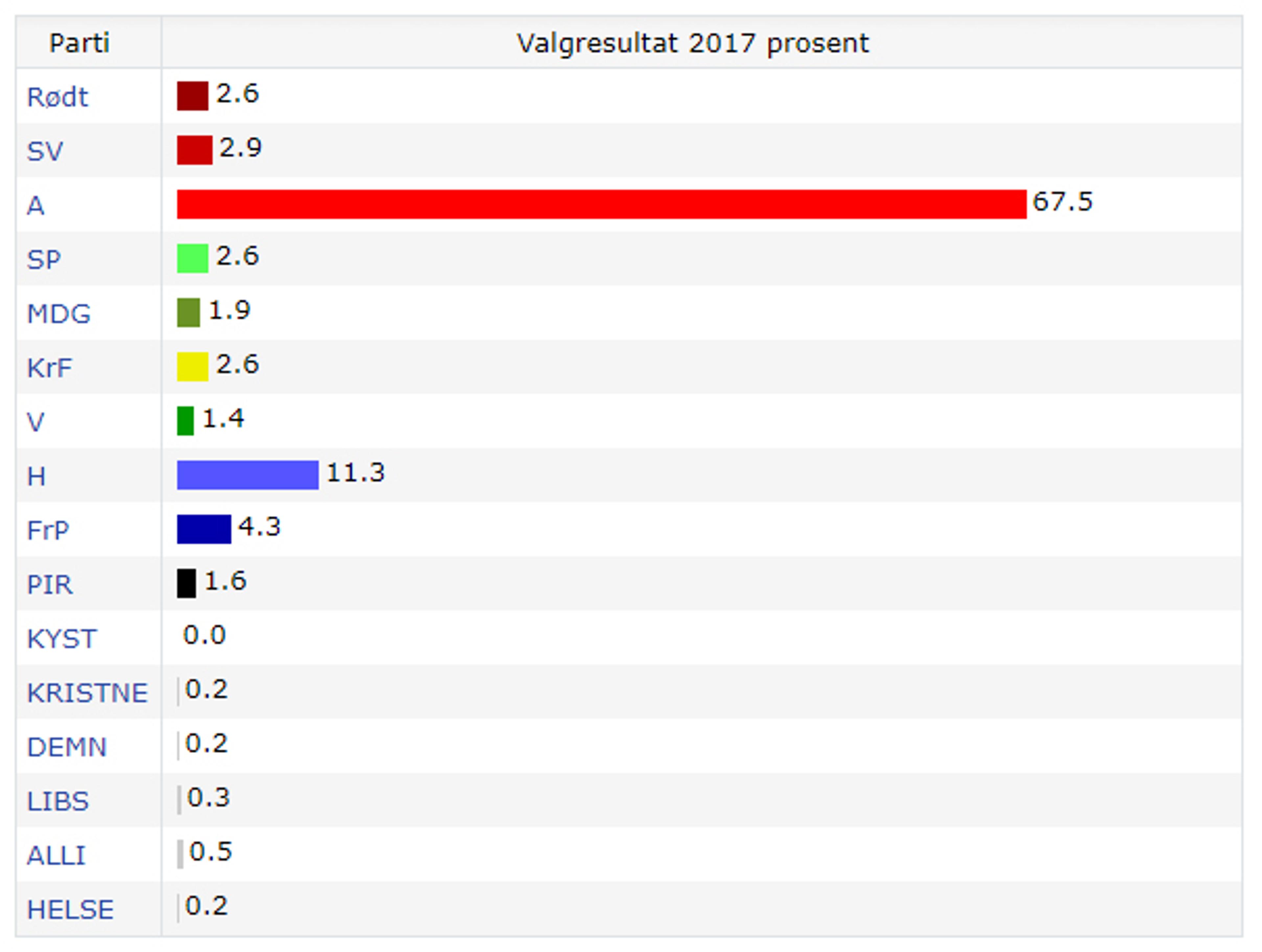 Men denne gangen ble det en rekordstor margin med 67,5 prosent av stemmene. Andreplassen går til Høyre med 11,3 prosent. Resten av de store partiene må finne seg i å vake helt nede sammen med småpartiene: