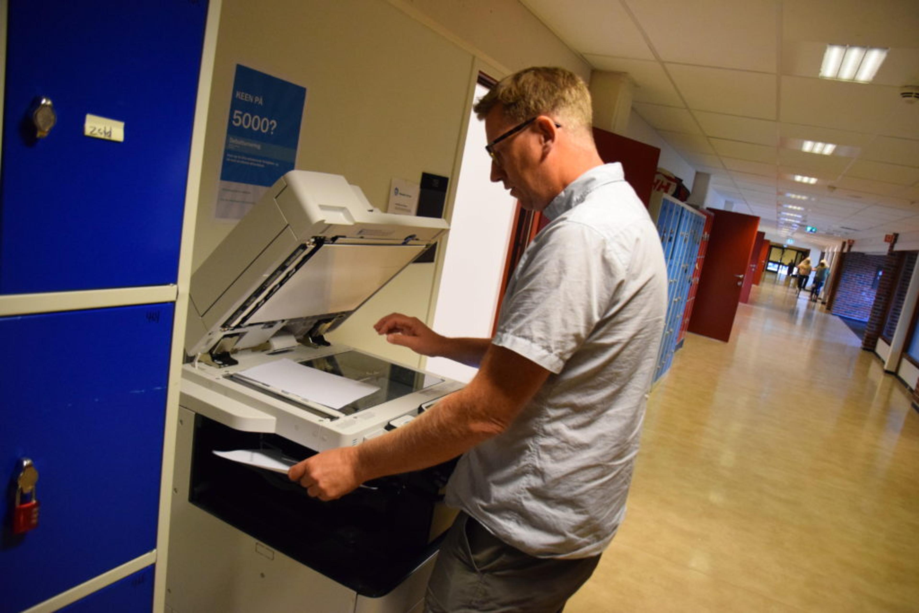 FERSKE SKOLEVALGRESULTATER: Faglærer Lars Erik Lund har akkurat fått resultatet fra elevene som organiserte og gjennomførte skoledebatt og skolevalg fra A til Å. Foto: Stian Ormestad.